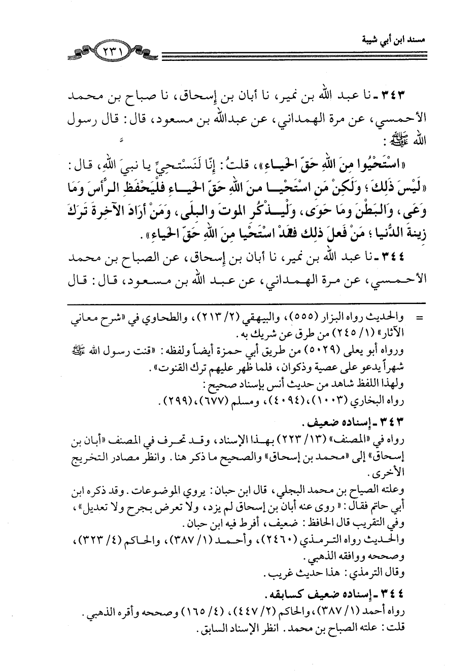 343 - نا عَبْدُ اللَّهِ بْنُ نُمَيْرٍ، نَا أَبَانُ بْنُ إِسْحَاقَ، نَا صَبَاحُ بْنُ مُحَمَّدٍ الْأَحْمَسِيُّ، عَنْ مُرَّةَ الْهَمْدَانِيِّ، عَنْ عَبْدِ اللَّهِ بْنِ مَسْعُودٍ، قَالَ: قَالَ رَسُولُ اللَّهِ صَلَّى اللهُ عَلَيْهِ وَسَلَّمَ: «§اسْتَحْيُوا مِنَ اللَّهِ حَقَّ الْحَيَاءِ» ، قُلْتُ: إِنَّا لَنَسْتَحِي يَا نَبِيَّ اللَّهِ، قَالَ: «لَيْسَ ذَلِكَ، وَلَكِنْ مَنِ اسْتَحْيَا مِنَ اللَّهِ حَقَّ الْحَيَاءِ فَلْيَحْفَظِ الرَّأْسَ وَمَا وَعَى، وَالْبَطْنَ وَمَا حَوَى، وَلْيَذْكُرِ الْمَوْتَ وَالْبِلَى، وَمَنْ أَرَادَ الْآخِرَةَ تَرَكَ زِينَةَ الدُّنْيَا، مَنْ فَعَلَ ذَلِكَ فَقَدِ اسْتَحْيَا مِنَ اللَّهِ حَقَّ الْحَيَاءِ»