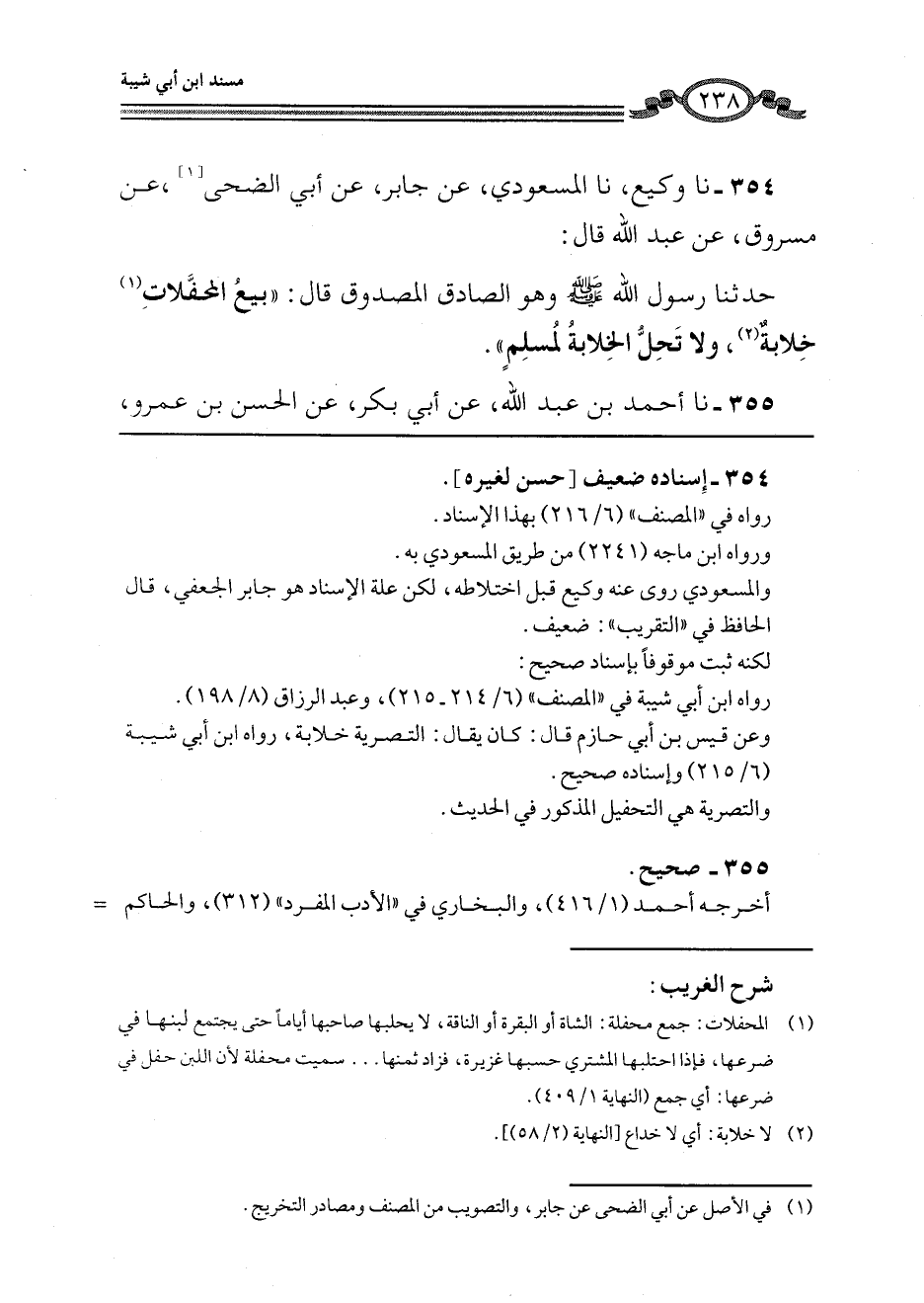 354 - نا وَكِيعٌ، نَا الْمَسْعُودِيُّ، عَنْ جَابِرٍ، عَنْ أَبِي الضُّحَى، عَنْ مَسْرُوقٍ، عَنْ عَبْدِ اللَّهِ، قَالَ: حَدَّثَنَا رَسُولُ اللَّهِ صَلَّى اللهُ عَلَيْهِ وَسَلَّمَ وَهُوَ الصَّادِقُ الْمَصْدُوقُ، قَالَ: «§بَيْعُ الْمُحَفَّلَاتِ خِلَابَةٌ، وَلَا تَحِلُّ الْخِلَابَةُ لِمُسْلِمٍ»
