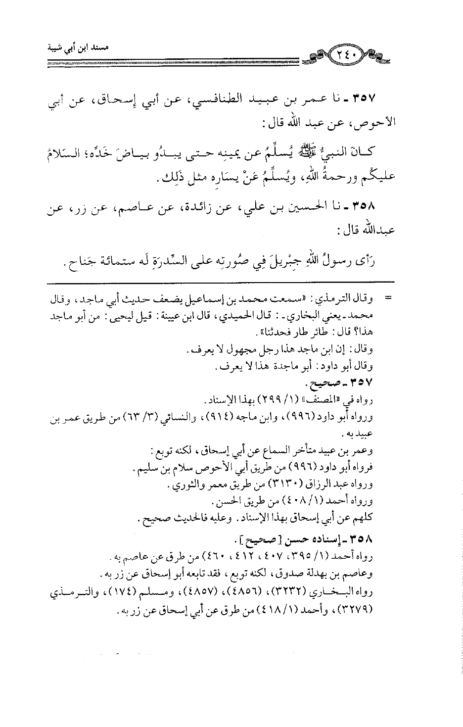 357 - نا عُمَرُ بْنُ عُبَيْدٍ الطَّنَافِسِيُّ، عَنْ أَبِي إِسْحَاقَ، عَنْ أَبِي الْأَحْوَصِ، عَنْ عَبْدِ اللَّهِ، قَالَ: كَانَ النَّبِيُّ صَلَّى اللهُ عَلَيْهِ وَسَلَّمَ «§يُسَلِّمُ عَنْ يَمِينِهِ حَتَّى يَبْدُو بَيَاضُ خَدِّهِ، السَّلَامُ عَلَيْكُمْ وَرَحْمَةُ اللَّهِ، وَيُسَلِّمُ عَنْ يَسَارِهِ مِثْلَ ذَلِكَ»