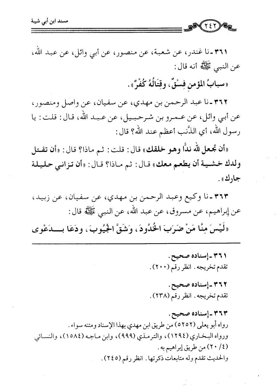 361 - نا غُنْدَرٌ، عَنْ شُعْبَةَ، عَنْ أَبِي وَائِلٍ، عَنْ عَبْدِ اللَّهِ، عَنِ النَّبِيِّ صَلَّى اللهُ عَلَيْهِ وَسَلَّمَ أَنَّهُ قَالَ: «§سِبَابُ الْمُؤْمِنِ فِسْقٌ، وَقِتَالُهُ كُفْرٌ»