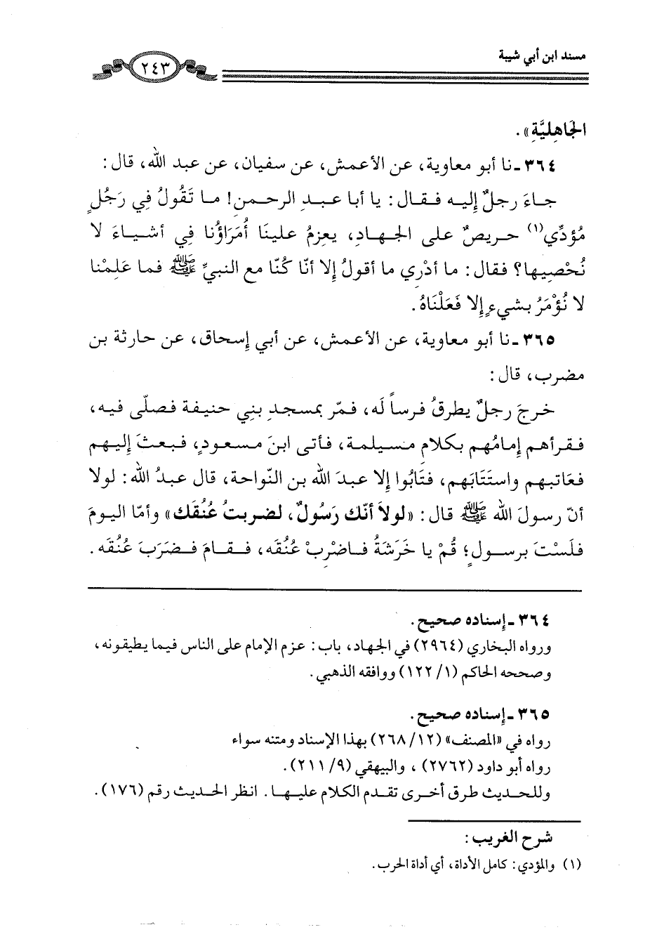 365 - نا أَبُو مُعَاوِيَةَ، عَنِ الْأَعْمَشِ، عَنْ أَبِي إِسْحَاقَ، عَنْ حَارِثَةَ بْنِ مُضَرِّبٍ، قَالَ: خَرَجَ رَجُلٌ يَطْرُقُ فَرَسًا لَهُ، فَمَرَّ بِمَسْجِدِ بَنِي حَنِيفَةَ فَصَلَّى فِيهِ، فَقَرَأَهُمْ إِمَامُهُمْ بِكَلَامِ مُسَيْلِمَةَ، فَأَتَى ابْنَ مَسْعُودٍ، فَبَعَثَ إِلَيْهِمْ فَعَاتَبَهُمْ وَاسْتَتَابَهُمْ، فَتَابُوا إِلَّا عَبْدُ اللَّهِ بْنُ النَّوَّاحَةِ، قَالَ عَبْدُ اللَّهِ: لَوْلَا أَنَّ رَسُولَ اللَّهِ صَلَّى اللهُ عَلَيْهِ وَسَلَّمَ قَالَ: «§لَوْلَا أَنَّكَ رَسُولٌ، لَضَرَبْتُ عُنُقَكَ» وَأَمَّا الْيَوْمَ فَلَسْتَ بِرَسُولٍ، قُمْ يَا خَرَشَةُ فَاضْرِبْ عُنُقَهُ، فَقَامَ فَضَرَبَ عُنُقَهُ