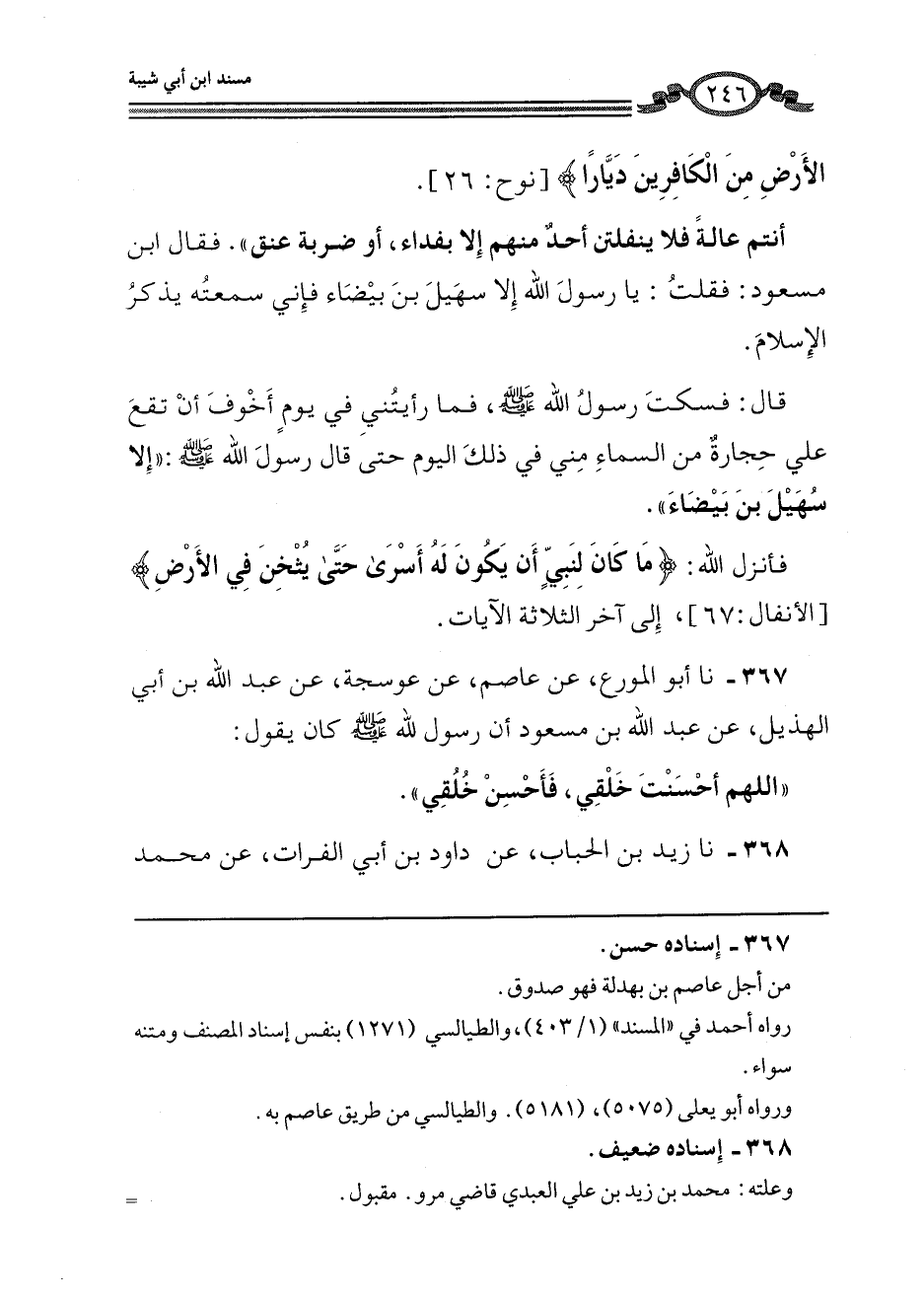367 - نا أَبُو الْمُوَرِّعِ، عَنْ عَاصِمٍ، عَنْ عَوْسَجَةَ، عَنْ عَبْدِ اللَّهِ بْنِ أَبِي الْهُذَيْلِ، عَنْ عَبْدِ اللَّهِ بْنِ مَسْعُودٍ، أَنَّ رَسُولَ اللَّهِ صَلَّى اللهُ عَلَيْهِ وَسَلَّمَ كَانَ يَقُولُ: «§اللَّهُمَّ أَحْسَنْتَ خَلْقِي، فَأَحْسَنْ خُلُقِي»
