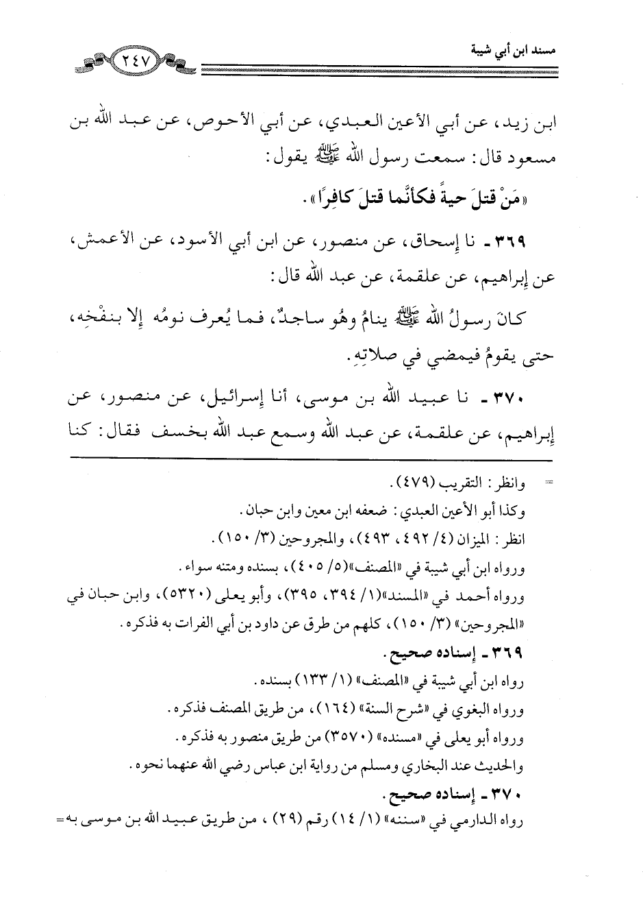369 - نا إِسْحَاقُ، عَنْ مَنْصُورِ بْنِ أَبِي الْأَسْوَدِ، عَنِ الْأَعْمَشِ، عَنْ إِبْرَاهِيمَ، عَنْ عَلْقَمَةَ، عَنْ عَبْدِ اللَّهِ، قَالَ: كَانَ رَسُولُ اللَّهِ صَلَّى اللهُ عَلَيْهِ وَسَلَّمَ «§يَنَامُ وَهُوَ سَاجِدٌ، فَمَا يُعْرَفُ نَوْمُهُ إِلَّا بِنَفْخِهِ، حَتَّى يَقُومَ فَيَمْضِي فِي صَلَاتِهِ»