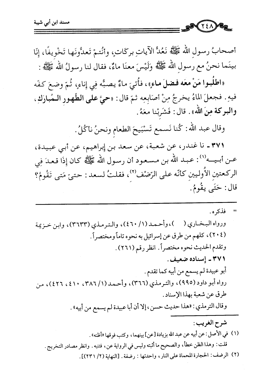 371 - نا غُنْدَرٌ، عَنْ شُعْبَةَ، عَنْ سَعْدِ بْنِ إِبْرَاهِيمَ، عَنْ أَبِي عُبَيْدَةَ، عَنْ أَبِيهِ عَبْدِ اللَّهِ بْنِ مَسْعُودٍ، أَنَّ رَسُولَ اللَّهِ صَلَّى اللهُ عَلَيْهِ وَسَلَّمَ كَانَ «§إِذَا قَعَدَ فِي الرَّكْعَتَيْنِ الْأُولَيَيْنِ كَأَنَّهُ عَلَى الرَّضْفِ» ، فَقُلْتُ لِسَعْدٍ: حَتَّى مَتَى تَقُومَ؟ قَالَ: حَتَّى يَقُومَ