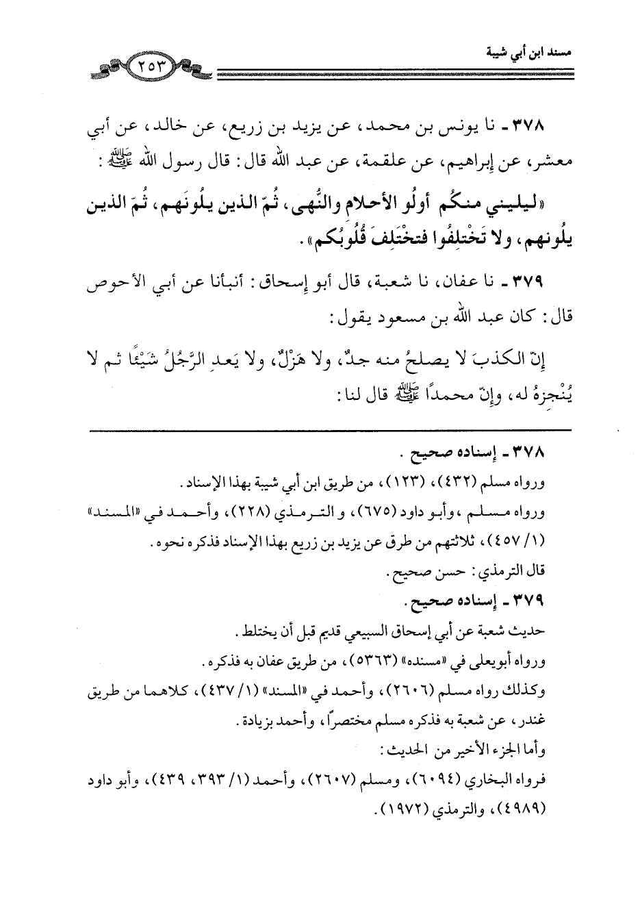 378 - نا يُونُسُ بْنُ مُحَمَّدٍ، عَنْ يَزِيدَ بْنَ زُرَيْعٍ، عَنْ خَالِدٍ، عَنْ أَبِي مَعْشَرٍ، عَنْ إِبْرَاهِيمَ، عَنْ عَلْقَمَةَ، عَنْ عَبْدِ اللَّهِ، قَالَ: قَالَ رَسُولُ اللَّهِ صَلَّى اللهُ عَلَيْهِ وَسَلَّمَ: «§لِيَلِينِي مِنْكُمْ أُولُو الْأَحْلَامِ وَالنُّهَى، ثُمَّ الَّذِينَ يَلُونَهُمْ، ثُمَّ الَّذِينَ يَلُونَهُمْ، وَلَا تَخْتَلِفُوا فَتَخْتَلِفَ قُلُوبُكُمْ»