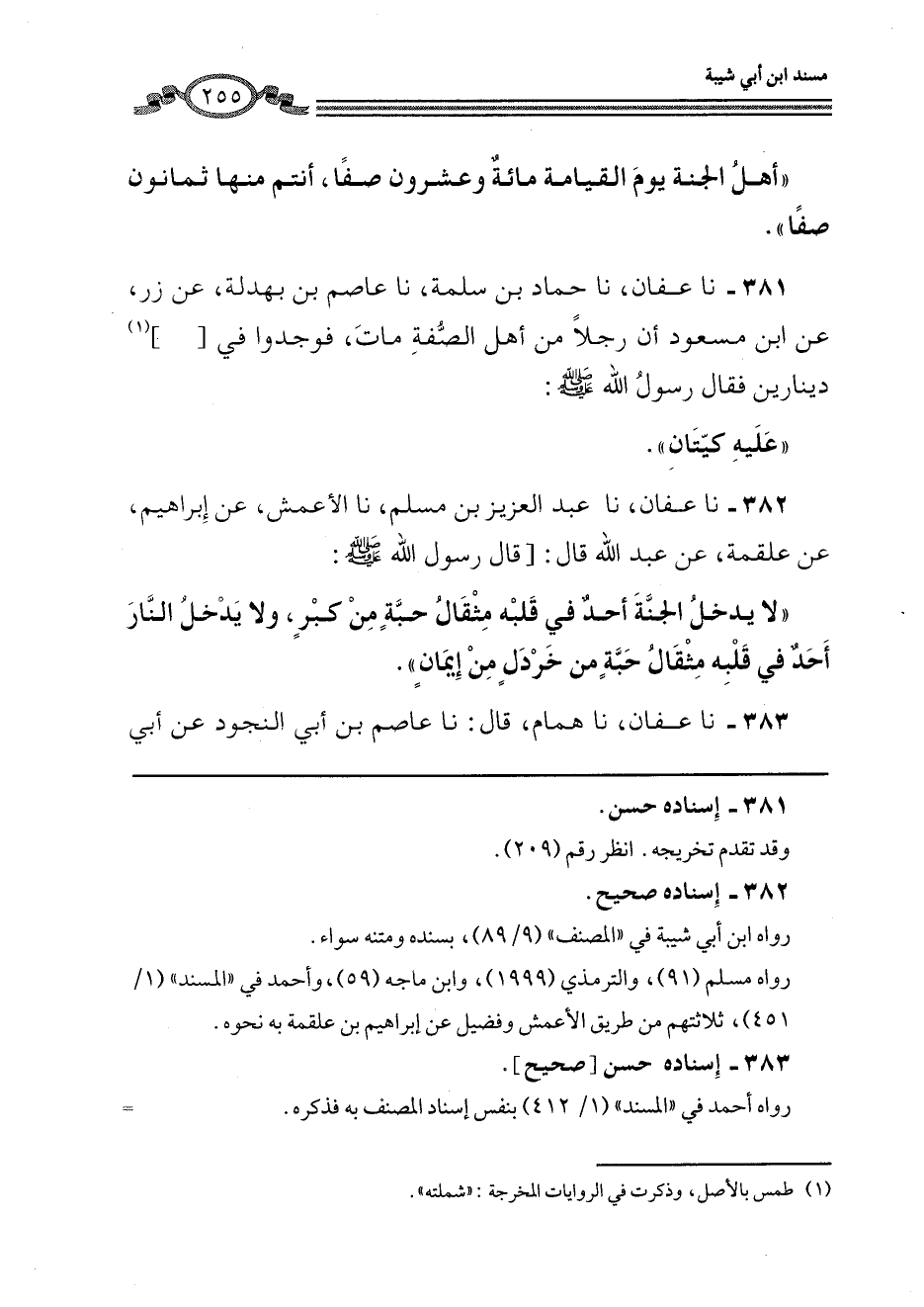 382 - نا عَفَّانُ، نَا عَبْدُ الْعَزِيزِ بْنُ مُسْلِمٍ، نَا الْأَعْمَشُ، عَنْ إِبْرَاهِيمَ، عَنْ عَلْقَمَةَ، عَنْ عَبْدِ اللَّهِ، قَالَ: قَالَ رَسُولُ اللَّهِ صَلَّى اللهُ عَلَيْهِ وَسَلَّمَ: «§لَا يَدْخُلُ الْجَنَّةَ أَحَدٌ فِي قَلْبِهِ مِثْقَالَ حَبَّةٍ مِنْ كِبْرٍ، وَلَا يَدْخُلُ النَّارَ أَحَدٌ فِي قَلْبِهِ مِثْقَالَ حَبَّةٍ مِنْ خَرْدَلٍ مِنْ إِيمَانٍ»