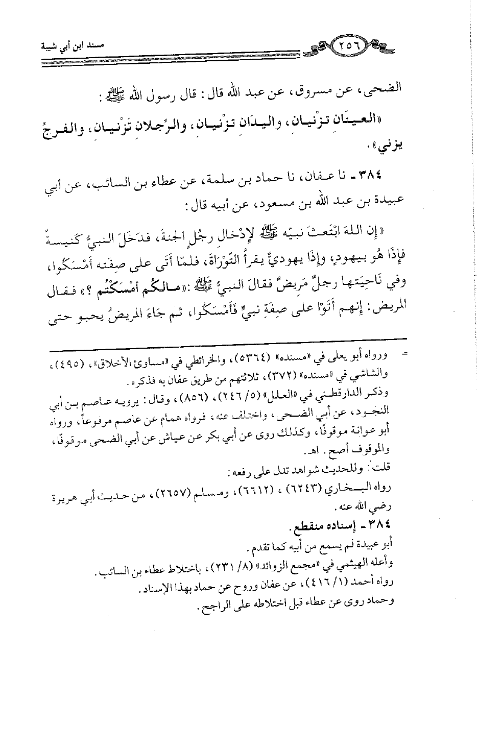 384 - نا عَفَّانُ، نَا حَمَّادُ بْنُ سَلَمَةَ، عَنْ عَطَاءِ بْنِ السَّائِبِ، عَنْ أَبِي عُبَيْدَةَ بْنِ عَبْدِ اللَّهِ بْنِ مَسْعُودٍ، عَنْ أَبِيهِ، قَالَ: إِنَّ اللَّهَ ابْتَعَثَ نَبِيَّهُ صَلَّى اللهُ عَلَيْهِ وَسَلَّمَ لِإِدْخَالِ رَجُلٍ الْجَنَّةَ، فَدَخَلَ النَّبِيُّ كَنِيسَةً فَإِذَا هُوَ بِيَهُودَ، وَإِذَا يَهُودِيٌّ يَقْرَأُ التَّوْرَاةَ، فَلَمَّا أَتَى عَلَى صِفَتِهِ أَمْسَكُوا، وَفِي نَاحِيَتِهَا رَجُلٌ مَرِيضٌ، فَقَالَ النَّبِيُّ صَلَّى اللهُ عَلَيْهِ وَسَلَّمَ: «§مَا لَكُمْ أَمْسَكْتُمْ؟» فَقَالَ الْمَرِيضُ: إِنَّهُمْ أَتَوْا عَلَى صِفَةِ نَبِيٍّ فَأَمْسَكُوا، ثُمَّ جَاءَ الْمَرِيضُ يَحْبُو حَتَّى -[257]- أَخَذَ التَّوْرَاةَ، وَقَالَ: ارْفَعْ يَدَكَ، فَقَالَ: فَقَرَأَ حَتَّى أَتَى عَلَى صِفَتِهِ، فَقَالَ: هَذِهِ صِفَتُكَ وَصِفَةُ أُمَّتِكَ فَقَالَ: أَشْهَدُ أَنْ لَا إِلَهَ إِلَّا اللَّهُ، وَأَنَّكَ رَسُولُ اللَّهِ، ثُمَّ مَاتَ، فَقَالَ النَّبِيُّ صَلَّى اللهُ عَلَيْهِ وَسَلَّمَ: «لُوا أَخَاكُمْ»