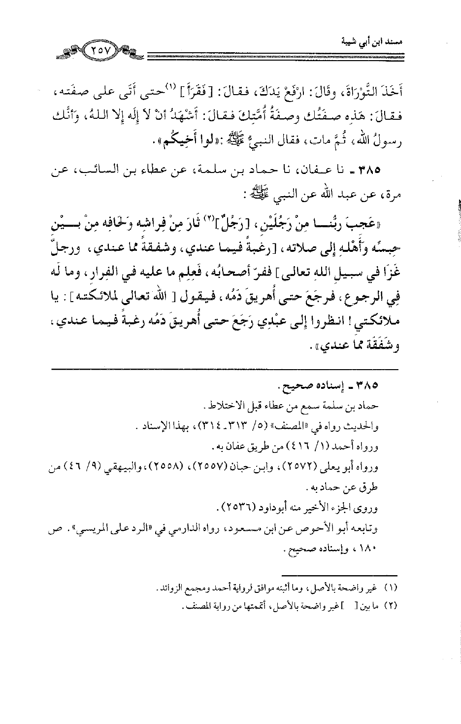 385 - نا عَفَّانُ، نَا حَمَّادُ بْنُ سَلَمَةَ، عَنْ عَطَاءِ بْنِ السَّائِبِ، عَنْ مُرَّةَ، عَنْ عَبْدِ اللَّهِ، عَنِ النَّبِيِّ صَلَّى اللهُ عَلَيْهِ وَسَلَّمَ: " عَجِبَ رَبُّنَا مِنْ رَجُلَيْنِ: رَجُلٌ ثَارَ مِنْ فِرَاشِهِ وَلِحَافِهِ مِنْ بَيْنِ حِبِسِّهِ وَأَهْلِهِ إِلَى صَلَاتِهِ، رَغْبَةً فِيمَا عِنْدِي، وَشَفَقَةً مِمَّا عِنْدِي، وَرَجُلٌ غَزَا فِي سَبِيلِ اللَّهِ تَعَالَى فَفَرَّ أَصْحَابُهُ، فَعَلِمَ مَا عَلَيْهِ فِي الْفِرَارِ، وَمَا لَهُ فِي الرُّجُوعِ، فَرَجَعَ حَتَّى أُهَرِيقَ دَمُهُ، فَيَقُولُ اللَّهُ تَعَالَى لِمَلَائِكَتِهِ: §يَا مَلَائِكَتِي انْظُرُوا إِلَى عَبْدِي رَجَعَ حَتَّى أُهَرِيقَ دَمُهُ رَغْبَةً فِيمَا عِنْدِي، وَشَفَقَةً مِمَّا عِنْدِي "