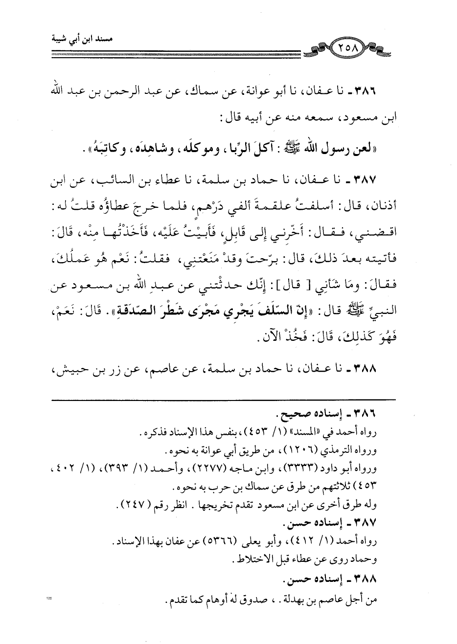 386 - نا عَفَّانُ، نَا أَبُو عَوَانَةَ، عَنْ سِمَاكٍ، عَنْ عَبْدِ الرَّحْمَنِ بْنِ عَبْدِ اللَّهِ بْنِ مَسْعُودٍ، سَمِعَهُ مِنْهُ، عَنْ أَبِيهِ، قَالَ: " §لَعَنَ رَسُولُ اللَّهِ صَلَّى اللهُ عَلَيْهِ وَسَلَّمَ: آكِلَ الرِّبَا، وَمُوكِلَهُ، وَشَاهِدَهُ، وَكَاتِبَهُ "