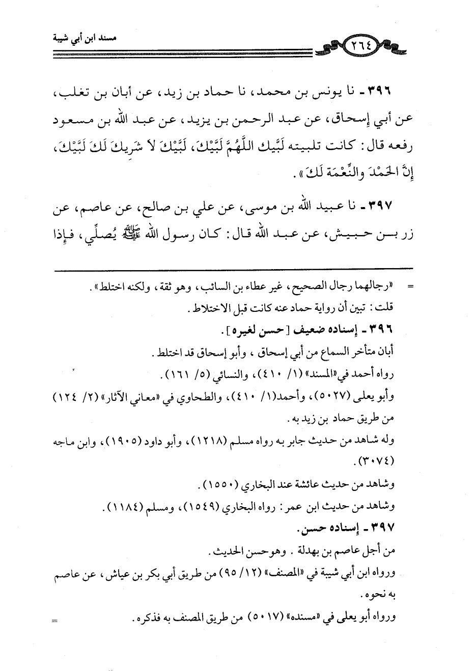 396 - نا يُونُسُ بْنُ مُحَمَّدٍ، نَا حَمَّادُ بْنُ زَيْدٍ، عَنْ أَبَانَ بْنِ تَغْلِبَ، عَنْ أَبِي إِسْحَاقَ، عَنْ عَبْدِ الرَّحْمَنِ بْنِ يَزِيدَ، عَنْ عَبْدِ اللَّهِ بْنِ مَسْعُودٍ، رَفَعَهُ، قَالَ: «كَانَتْ §تَلْبِيَتُهُ لَبَّيْكَ اللَّهُمَّ لَبَّيْكَ، لَبَّيْكَ لَا شَرِيكَ لَكَ لَبَّيْكَ، إِنَّ الْحَمْدَ وَالنِّعْمَةَ لَكَ»