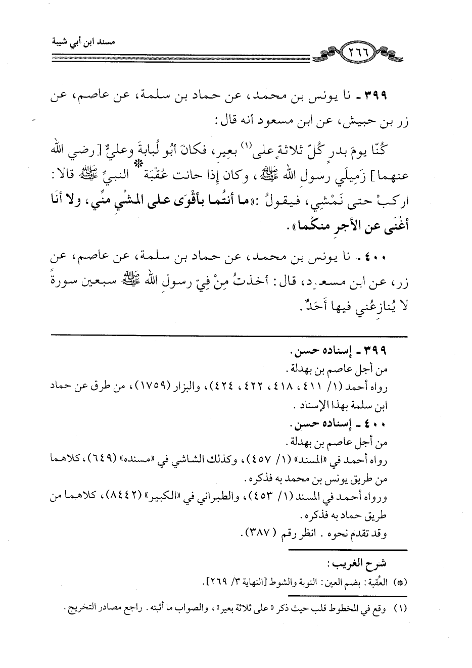 399 - نا يُونُسُ بْنُ مُحَمَّدٍ، عَنْ حَمَّادِ بْنِ سَلَمَةَ، عَنْ عَاصِمٍ، عَنْ زِرِّ بْنِ حُبَيْشٍ، عَنِ ابْنِ مَسْعُودٍ، أَنَّهُ قَالَ: كُنَّا يَوْمَ بَدْرٍ كُلُّ ثَلَاثَةٍ عَلَى بَعِيرٍ، فَكَانَ أَبُو لُبَابَةَ وَعَلِيٌّ رَضِيَ اللَّهُ عَنْهُمَا زَمِيلَيْ رَسُولِ اللَّهِ صَلَّى اللهُ عَلَيْهِ وَسَلَّمَ، وَكَانَ إِذَا حَانَتْ عُقْبَةُ النَّبِيِّ صَلَّى اللهُ عَلَيْهِ وَسَلَّمَ قَالَا: ارْكَبْ حَتَّى نَمْشِي، فَيَقُولُ: «§مَا أَنْتُمَا بِأَقْوَى عَلَى الْمَشْيِ مِنِّي، وَلَا أَنَا أَغْنَى عَنِ الْأَجْرِ مِنْكُمَا»