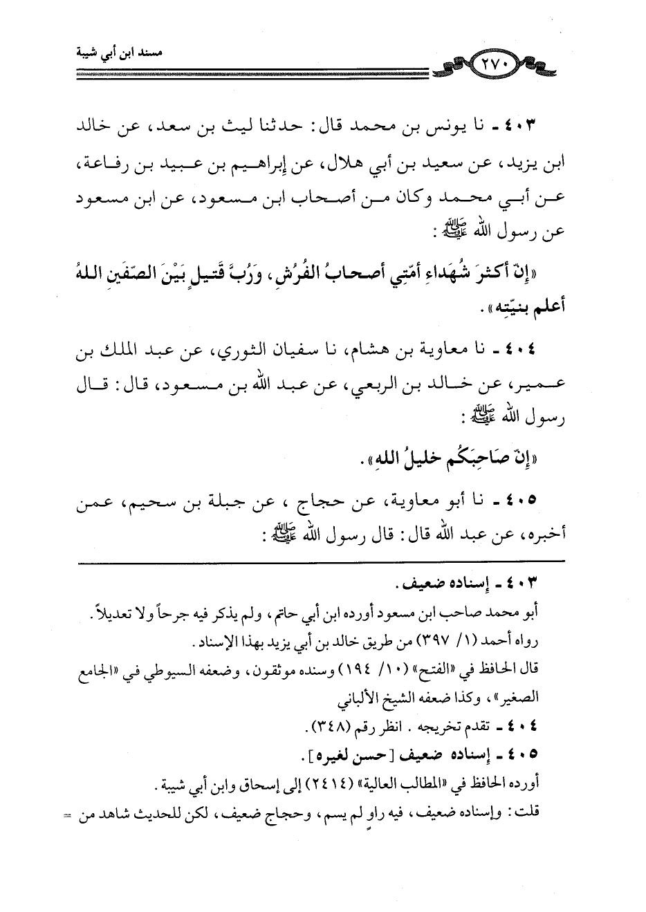 404 - نا مُعَاوِيَةُ بْنُ هِشَامٍ، نَا سُفْيَانُ الثَّوْرِيُّ، عَنْ عَبْدِ الْمَلِكِ بْنِ عُمَيْرٍ، عَنْ خَالِدِ بْنِ الرَّبْعِيِّ، عَنْ عَبْدِ اللَّهِ بْنِ مَسْعُودٍ، قَالَ: قَالَ رَسُولُ اللَّهِ صَلَّى اللهُ عَلَيْهِ وَسَلَّمَ: «إِنَّ §صَاحِبَكُمْ خَلِيلُ اللَّهِ»