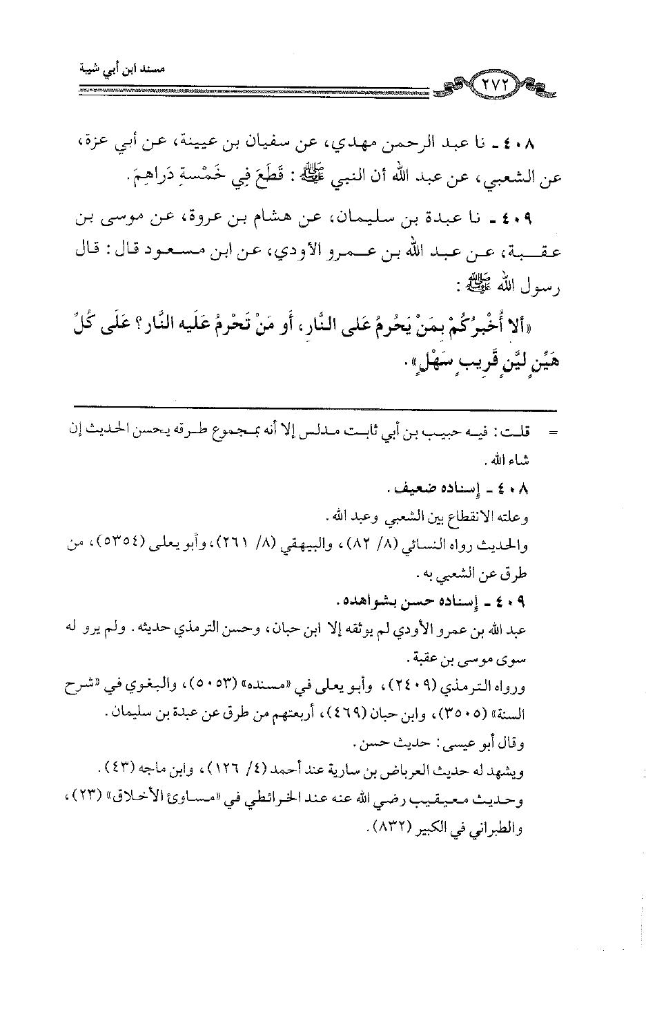 409 - نا عَبْدَةُ بْنُ سُلَيْمَانَ، عَنْ هِشَامِ بْنِ عُرْوَةَ، عَنْ مُوسَى بْنِ عُقْبَةَ، عَنْ عَبْدِ اللَّهِ بْنِ عَمْرٍو الْأَوْدِيِّ، عَنِ ابْنِ مَسْعُودٍ، قَالَ: قَالَ رَسُولُ اللَّهِ صَلَّى اللهُ عَلَيْهِ وَسَلَّمَ: «أَلَا §أُخْبِرُكُمْ بِمَنْ يَحْرُمُ عَلَى النَّارِ، أَوْ مَنْ تُحَرَّمُ عَلَيْهِ النَّارُ؟ عَلَى كُلِّ هَيِّنٍ لَيِّنٍ قَرِيبٍ سَهْلٍ»