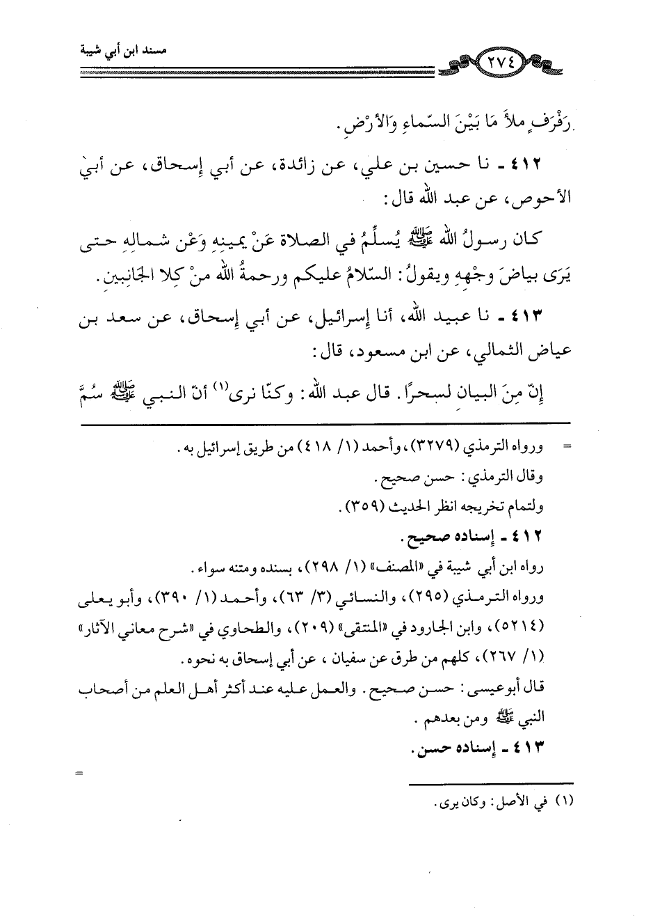 412 - نا حُسَيْنُ بْنُ عَلِيٍّ، عَنْ زَائِدَةَ، عَنْ أَبِي إِسْحَاقَ، عَنْ أَبِي الْأَحْوَصِ، عَنْ عَبْدِ اللَّهِ، قَالَ: كَانَ رَسُولُ اللَّهِ صَلَّى اللهُ عَلَيْهِ وَسَلَّمَ " §يُسَلِّمُ فِي الصَّلَاةِ عَنْ يَمِينِهِ، وَعَنْ شِمَالِهِ حَتَّى يَرَى بَيَاضَ وَجْهِهِ، وَيَقُولُ: السَّلَامُ عَلَيْكُمْ وَرَحْمَةُ اللَّهِ مِنْ كِلَا الْجَانِبَيْنِ "