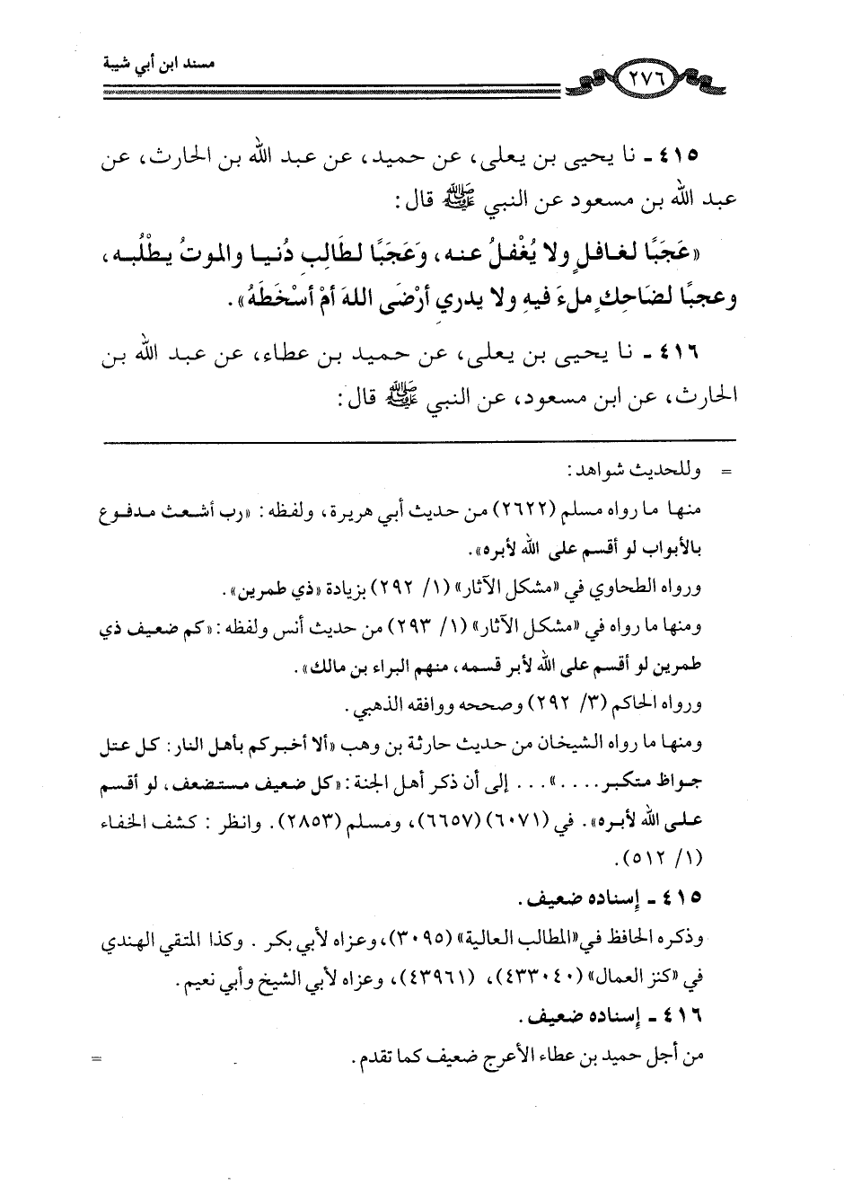 415 - نا يَحْيَى بْنُ يَعْلَى، عَنْ حُمَيْدٍ، عَنْ عَبْدِ اللَّهِ بْنِ الْحَارِثِ، عَنْ عَبْدِ اللَّهِ بْنِ مَسْعُودٍ، عَنِ النَّبِيِّ صَلَّى اللهُ عَلَيْهِ وَسَلَّمَ قَالَ: «§عَجَبًا لِغَافِلٍ وَلَا يُغْفَلُ عَنْهُ، وَعَجَبًا لِطَالِبِ دُنْيَا وَالْمَوْتُ يَطْلُبُهُ، وَعَجَبًا لِضَاحِكٍ مِلْءَ فِيهِ وَلَا يَدْرِي أَرْضَى اللَّهَ أَمْ أَسْخَطَهُ»