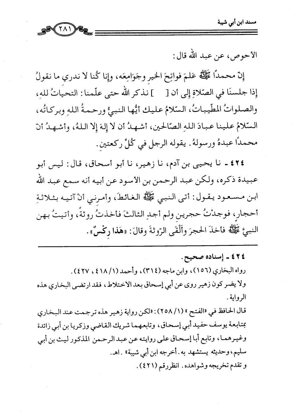 424 - نا يَحْيَى بْنُ آدَمَ، نَا زُهَيْرٌ، نَا أَبُو إِسْحَاقَ، قَالَ: - لَيْسَ أَبُو عُبَيْدَةَ ذَكَرَهُ -، وَلَكِنْ عَبْدُ الرَّحْمَنِ بْنُ الْأَسْوَدِ، عَنْ أَبِيهِ، أَنَّهُ سَمِعَ عَبْدَ اللَّهِ بْنَ مَسْعُودٍ، يَقُولُ: §أَتَى النَّبِيُّ صَلَّى اللهُ عَلَيْهِ وَسَلَّمَ الْغَائِطَ، وَأَمَرَنِي أَنْ آتِيَهُ بِثَلَاثَةِ أَحْجَارٍ، فَوَجَدْتُ حَجَرَيْنِ وَلَمْ أَجِدِ الثَّالِثَ، فَأَخَذْتُ رَوْثَةً، وَأَتَيْتُ بِهِنَّ النَّبِيَّ صَلَّى اللهُ عَلَيْهِ وَسَلَّمَ فَأَخَذَ الْحَجَرَ وَأَلْقَى الرَّوْثَةَ، وَقَالَ: «هَذَا رِكْسٌ»