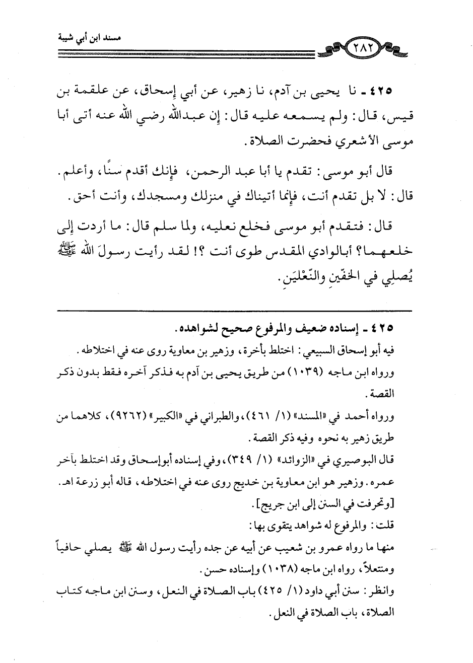 425 - نا يَحْيَى بْنُ آدَمَ، نَا زُهَيْرٌ، عَنْ أَبِي إِسْحَاقَ، عَنْ عَلْقَمَةَ بْنِ قَيْسٍ، قَالَ: - وَلَمْ يَسْمَعْهُ عَلَيْهِ - قَالَ: إِنَّ عَبْدَ اللَّهِ رَضِيَ اللَّهُ عَنْهُ أَتَى أَبَا مُوسَى الْأَشْعَرِيَّ فَحَضَرَتِ الصَّلَاةُ، قَالَ أَبُو مُوسَى: تَقَدَّمْ يَا أَبَا عَبْدِ الرَّحْمَنِ، فَإِنَّكَ أَقْدَمُ سِنًّا، وَأَعْلَمُ، قَالَ: لَا، بَلْ تَقَدَّمْ أَنْتَ، فَإِنَّمَا أَتَيْنَاكَ فِي مَنْزِلِكَ وَمَسْجِدِكَ، وَأَنْتَ أَحَقُّ. قَالَ: فَتَقَدَّمَ أَبُو مُوسَى فَخَلَعَ نَعْلَيْهِ، وَلَمَّا سَلَّمَ قَالَ: مَا أَرَدْتَ إِلَى خَلْعِهِمَا؟ أَبِالْوَادِي الْمُقَدَّسِ طُوًى أَنْتَ؟ لَقَدْ رَأَيْتُ رَسُولَ اللَّهِ صَلَّى اللهُ عَلَيْهِ وَسَلَّمَ: «§يُصَلِّي فِي الْخُفَّيْنِ وَالنَّعْلَيْنِ»