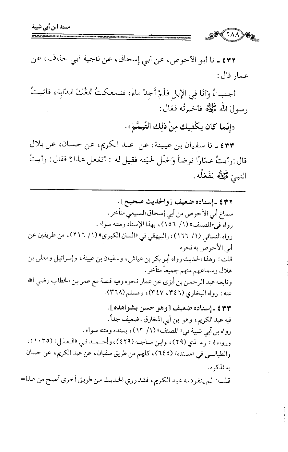 432 - نَا أَبُو الْأَحْوَصِ، عَنْ أَبِي إِسْحَاقَ، عَنْ نَاجِيَةَ أَبِي خُفَافٍ، عَنْ عَمَّارٍ، قَالَ: أَجْنَبْتُ وَأَنَا فِي الْإِبِلِ، فَلَمْ أَجِدْ مَاءً، فَتَمَعَّكْتُ تَمَعُّكَ الدَّابَّةِ، فَأَتَيْتُ رَسُولَ اللَّهِ صَلَّى اللهُ عَلَيْهِ وَسَلَّمَ فَأَخْبَرْتُهُ، فَقَالَ: «إِنَّمَا كَانَ §يَكْفِيكَ مِنْ ذَلِكَ التَّيَمُّمُ»