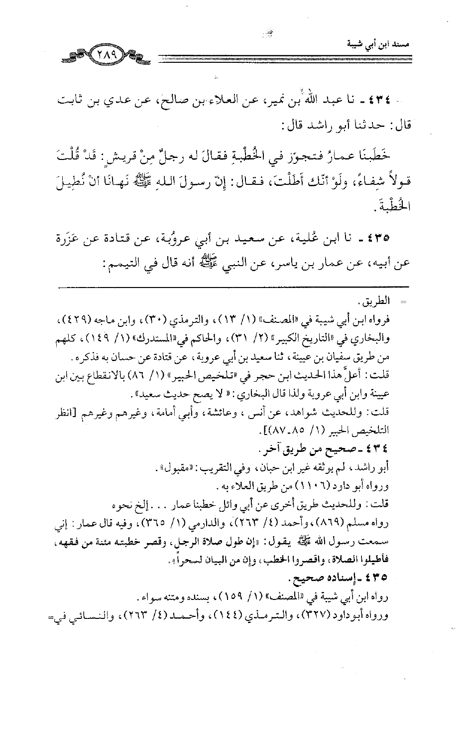 434 - نا عَبْدُ اللَّهِ بْنُ نُمَيْرٍ، عَنِ الْعَلَاءِ بْنِ صَالِحٍ، عَنْ عَدِيِّ بْنِ ثَابِتٍ، قَالَ: حَدَّثَنَا أَبُو رَاشِدٍ، قَالَ: خَطَبَنَا عَمَّارٌ فَتَجَوَّزَ فِي الْخُطْبَةِ، فَقَالَ لَهُ رَجُلٌ مِنْ قُرَيْشٍ: قَدْ قُلْتَ قَوْلًا شِفَاءً، وَلَوْ أَنَّكَ أَطَلْتَ، فَقَالَ: إِنَّ رَسُولَ اللَّهِ صَلَّى اللهُ عَلَيْهِ وَسَلَّمَ «§نَهَانَا أَنْ نُطِيلَ الْخُطْبَةَ»
