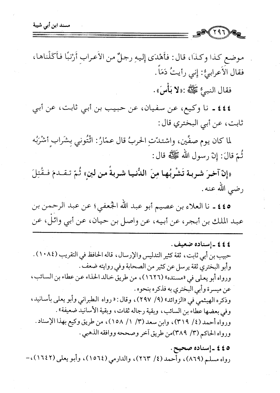 444 - نا وَكِيعٌ، عَنْ سُفْيَانَ، عَنْ حَبِيبِ بْنِ أَبِي ثَابِتٍ، عَنْ أَبِي ثَابِتٍ، عَنْ أَبِي الْبَخْتَرِيِّ، قَالَ: لَمَّا كَانَ يَوْمُ صِفِّينَ، وَاشْتَدَّتِ الْحَرْبُ، قَالَ عَمَّارٌ: ائْتُونِي بِشَرَابٍ أَشْرَبُهُ، ثُمَّ قَالَ: إِنَّ رَسُولَ اللَّهِ صَلَّى اللهُ عَلَيْهِ وَسَلَّمَ قَالَ: «إِنَّ §آخِرَ شَرْبَةٍ تَشْرَبُهَا مِنَ الدُّنْيَا شَرْبَةً مِنْ لَبَنٍ» ، ثُمَّ تَقَدَّمَ فَقُتِلَ رَضِيَ اللَّهُ عَنْهُ