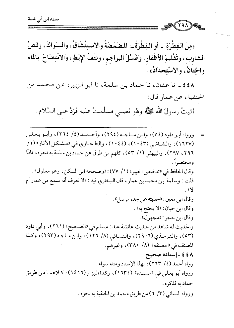 448 - نا عَفَّانُ، نَا حَمَّادُ بْنُ سَلَمَةَ، نَا أَبُو الزُّبَيْرِ، عَنْ مُحَمَّدِ ابْنِ الْحَنَفِيَّةِ، عَنْ عَمَّارٍ، قَالَ: أَتَيْتُ رَسُولَ اللَّهِ صَلَّى اللهُ عَلَيْهِ وَسَلَّمَ وَهُوَ «§يُصَلِّي، فَسَلَّمْتُ عَلَيْهِ، فَرَدَّ عَلَيَّ السَّلَامَ»