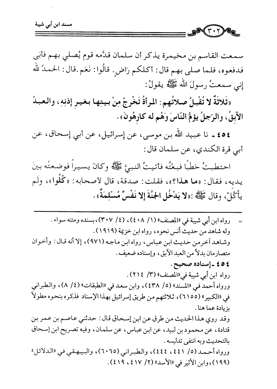 454 - نَا عُبَيْدُ اللَّهِ بْنُ مُوسَى، عَنْ إِسْرَائِيلَ، عَنْ أَبِي إِسْحَاقَ، عَنْ أَبِي قُرَّةَ الْكِنْدِيِّ، عَنْ سَلْمَانَ، قَالَ: احْتَطَبْتُ حَطَبًا فَبِعْتُهُ، فَأَتَيْتُ النَّبِيَّ صَلَّى اللهُ عَلَيْهِ وَسَلَّمَ وَكَانَ يَسِيرًا، فَوَضَعْتُهُ بَيْنَ يَدَيْهِ، فَقَالَ: «مَا هَذَا؟» ، فَقُلْتُ: صَدَقَةٌ، قَالَ لِأَصْحَابِهِ: «كُلُوا» ، وَلَمْ يَأْكُلْ، وَقَالَ صَلَّى اللهُ عَلَيْهِ وَسَلَّمَ: «§لَا يَدْخُلُ الْجَنَّةَ إِلَّا نَفْسٌ مَسْلَمَةٌ»
