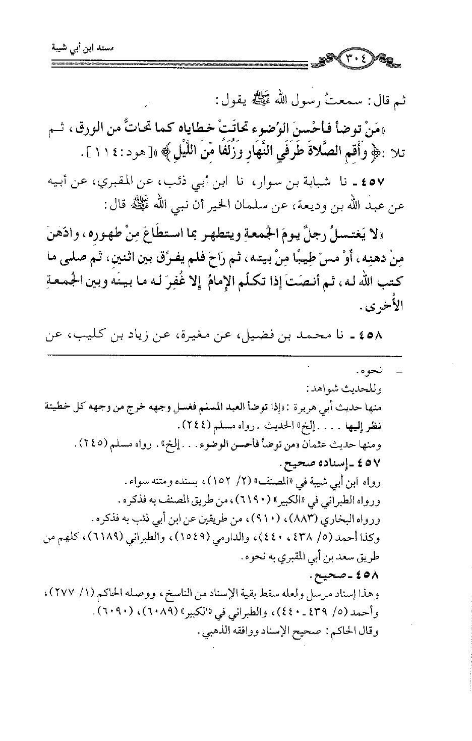 457 - نا شَبَابَةُ بْنُ سَوَّارٍ، نَا ابْنُ أَبِي ذِئْبٍ، عَنِ الْمَقْبُرِيِّ، عَنْ أَبِيهِ، عَنْ عَبْدِ اللَّهِ بْنِ وَدِيعَةَ، عَنْ سَلْمَانَ الْخَيْرِ، أَنَّ نَبِيَّ اللَّهِ صَلَّى اللهُ عَلَيْهِ وَسَلَّمَ قَالَ: «§لَا يَغْتَسِلُ رَجُلٌ يَوْمَ الْجُمُعَةِ وَيَتَطَهَّرُ بِمَا اسْتَطَاعَ مِنْ طُهُورِهِ، وَادَّهَنَ مِنْ دُهْنِهِ، أَوْ مَسَّ طَيِبًا مِنْ بَيْتِهِ، ثُمَّ رَاحَ فَلَمْ يُفَرِّقْ بَيْنَ اثْنَيْنِ، ثُمَّ صَلَّى مَا كَتَبَ اللَّهُ لَهُ، ثُمَّ أَنْصَتَ إِذَا تَكَلَّمَ الْإِمَامُ إِلَّا غُفِرَ لَهُ مَا بَيْنَهُ وَبَيْنَ الْجُمُعَةِ الْأُخْرَى»