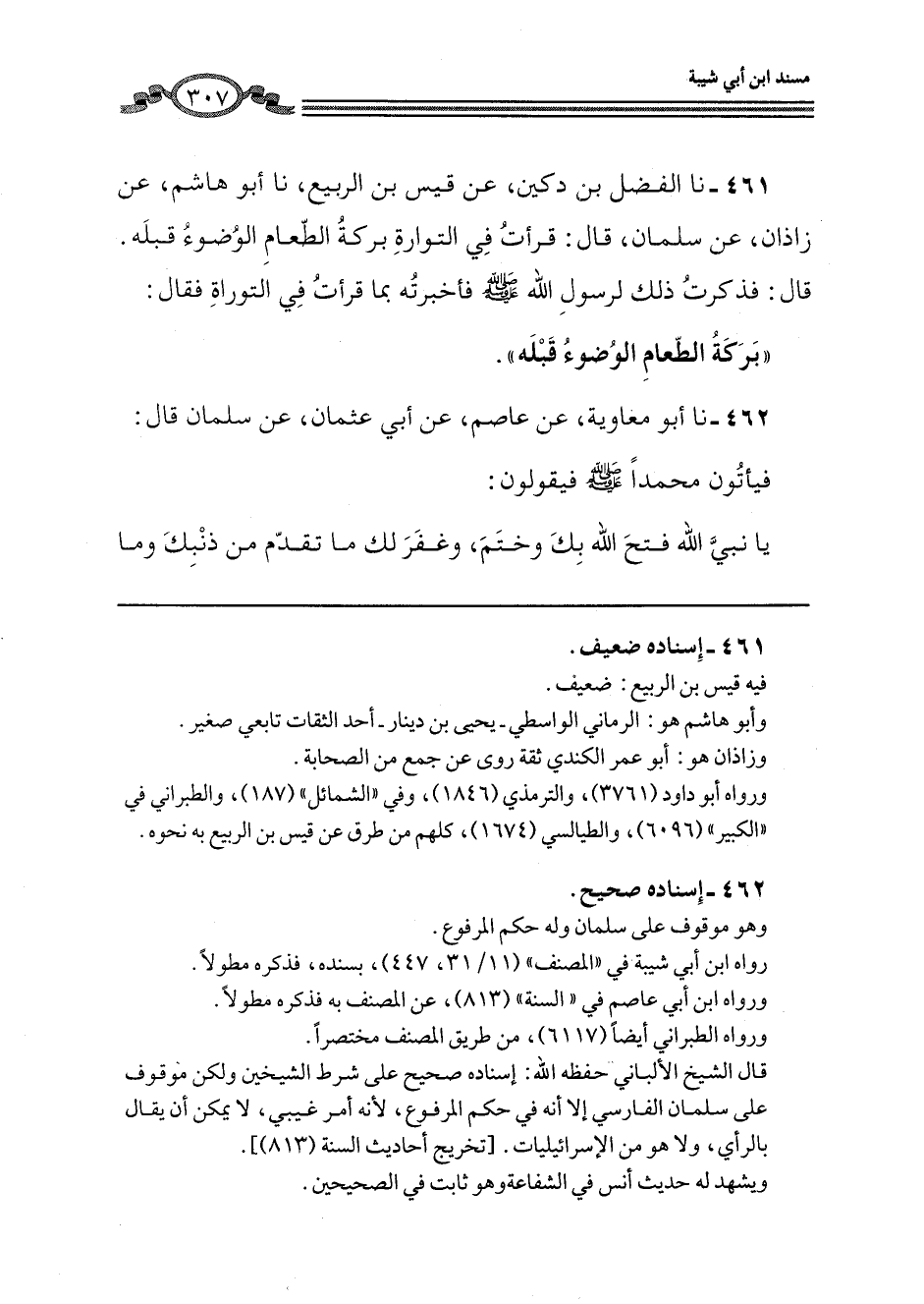 461 - نا الْفَضْلُ بْنُ دُكَيْنٍ، عَنْ قَيْسِ بْنِ الرَّبِيعِ، نَا أَبُو هَاشِمٍ، عَنْ زَاذَانَ، عَنْ سَلْمَانَ، قَالَ: قَرَأْتُ فِي التَّوْرَاةِ بَرَكَةُ الطَّعَامِ الضَّوْءُ قَبْلَهُ، قَالَ: فَذَكَرْتُ ذَلِكَ لِرَسُولِ اللَّهِ صَلَّى اللهُ عَلَيْهِ وَسَلَّمَ فَأَخْبَرْتُهُ بِمَا قَرَأْتُ فِي التَّوْرَاةِ، فَقَالَ: «§بَرَكَةُ الطَّعَامِ الْوُضُوءُ قَبْلَهُ»