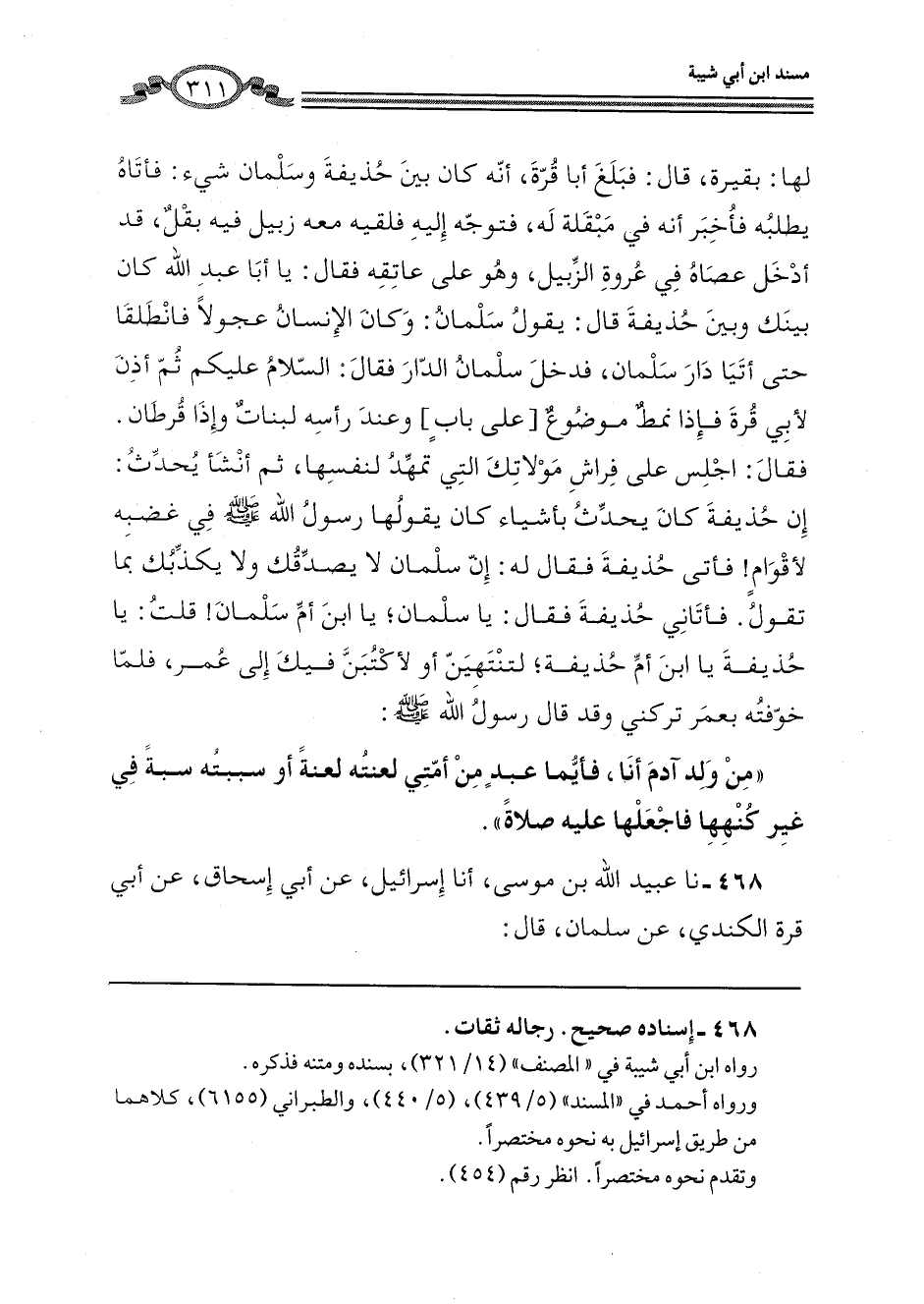 468 - نا عُبَيْدُ اللَّهِ بْنُ مُوسَى، أَنَا إِسْرَائِيلُ، عَنْ أَبِي إِسْحَاقَ، عَنْ أَبِي قُرَّةَ الْكِنْدِيِّ، عَنْ سَلْمَانَ، قَالَ -[312]-: كُنْتُ مِنْ أَبْنَاءِ أَسَاوِرَةِ فَارِسَ، وَكُنْتُ فِي كُتَّابٍ، وَكَانَ مَعِي غُلَامَانِ، وَكَانَا إِذَا رَجَعَا مِنْ مُعَلِّمِهِمَا أَتَيَا قِسًّا فَدَخَلَا عَلَيْهِ، فَدَخَلْتُ مَعَهُمَا عَلَيْهِ، فَقَالَ: أَلَمْ أَنْهَكُمَا أَنْ تَأْتِيَانِي بِأَحَدٍ، فَجَعَلْتُ أَخْتَلِفُ إِلَيْهِ حَتَّى كُنْتُ أَحَبَّ إِلَيْهِ مِنْهُمَا، فَقَالَ لِي: إِذَا سَأَلَكَ أَهْلُكَ مَنْ حَبَسَكَ؟ فَقُلْ مُعَلِّمِي، وَإِذَا سَأَلَكَ مُعَلِّمُكَ مَنْ حَبَسَكَ؟ فَقُلْ أَهْلِي، ثُمَّ إِنَّهُ أَرَادَ أَنْ يَتَحَوَّلَ، فَقُلْتُ لَهُ: أَنَا أَتَحَوَّلُ مَعَكَ، فَتَحَوَّلْتُ مَعَهُ، فَنَزَلْنَا قَرْيَةً، فَكَانَتِ امْرَأَةٌ تَأْتِيهِ، فَلَمَّا حَضَرَ قَالَ لِي: يَا سَلْمَانُ احْفُرْ عِنْدَ رَأْسِي، فَحَفَرْتُ عِنْدَ رَأْسِهِ، فَاسْتَخْرَجْتُ جَرَّةً مِنْ دَرَاهِمَ فَقَالَ لِي: صُبَّها عَلَى صَدْرِي، فَصَبَبْتُهَا عَلَى صَدْرِهِ فَكَانَ يَقُولُ: وَيْلُ لِاقْتِنَائِي، ثُمَّ إِنَّهُ مَاتَ فَهَمَمْتُ بِالدَّرَاهِمِ أَنْ آخُذَهَا ثُمَّ إِنِّي ذَكَرْتُ فَتَرَكْتُهَا، ثُمَّ إِنِّي آذَنْتُ الْقِسِّيسِينَ وَالرُّهْبِانَ بِهِ فَحَضَرُوهُ فَقُلْتُ لَهُمْ: إِنَّهُ قَدْ تَرَكَ مَالًا، فَقَامَ شَبَابٌ فِي الْقَرْيَةِ فَقَالُوا: هَذَا مَالُ أَبِينَا، فَأَخَذُوهُ، فَقُلْتُ لِلرُّهْبَانِ: أَخْبِرُونِي بِرَجُلٍ عَالِمِ أَتَّبِعْهُ، قَالُوا: مَا نَعْلَمُ فِي الْأَرْضِ رَجُلًا أَعْلَمَ مِنْ رَجُلٍ بِحِمْصٍ، فَانْطَلَقْتُ إِلَيْهِ فَلَقِيتُهُ فَقَصَصْتُ عَلَيْهِ الْقِصَّةَ، فَقَالَ: أَوَمَا جَاءَ بِكَ إِلَّا طَلَبُ الْعِلْمِ؟ قُلْتُ: مَا جَاءَ بِي إِلَّا طَلَبُ الْعِلْمِ، قَالَ: فَإِنِّي لَا أَعْلَمُ الْيَوْمَ فِي الْأَرْضِ أَعْلَمَ مِنْ رَجُلٍ يَأْتِي بَيْتَ الْمَقْدِسِ كُلَّ سَنَةٍ، إِنِ انْطَلَقْتَ الْآنَ وَجَدْتَ حِمَارَهُ، قَالَ: فَانْطَلَقْتُ فَإِذَا أَنَا بِحِمَارِهِ عَلَى بَابِ بَيْتِ الْمَقْدِسِ، فَجَلَسْتُ عِنْدَهُ وَانْطَلَقَ، فَلَمْ أَرَهُ حَتَّى الْحَوْلِ، فَجَاءَ، فَقُلْتُ لَهُ: يَا عَبْدَ اللَّهِ، مَا صَنَعْتَ بِي؟ قَالَ: وَإِنَّكَ لَهَاهُنَا؟ قُلْتُ: نَعَمْ. قَالَ: فَإِنِّي وَاللَّهِ مَا أَعْلَمُ الْيَوْمَ رَجُلًا أَعْلَمَ مِنْ -[313]- رَجُلٍ خَرَجَ بِأَرْضِ تَيْمَاءَ، وَإِنْ تَنْطَلِقِ الْآنَ تُوَافِقْهُ، وَفِيهِ ثَلَاثُ آيَاتٍ: يَأْكُلُ الْهَدِيَّةَ، وَلَا يَأْكُلُ الصَّدَقَةَ، وَعِنْدَ غُضْرُوفٍ فِي كَتِفِهِ الْيُمْنَى خَاتَمُ النُّبُوَّةِ، مِثْلُ بَيْضَةِ الْحَمَامَةِ، لَوْنُهَا لَوْنُ جِلْدِهِ، قَالَ: فَانْطَلَقْتُ تَرْفَعُنِي أَرْضٌ، وَتُخْفِضُنِي أُخْرَى، حَتَّى مَرَرْتُ بِقَوْمٍ مِنَ الْأَعْرَابِ فَاسْتَعْبَدُونِي، فَبَاعُونِي حَتَّى اشْتَرَتْنِي امْرَأَةٌ بِالْمَدِينَةِ، فَسَمِعْتُهُمْ يَذْكُرُونَ النَّبِيَّ صَلَّى اللهُ عَلَيْهِ وَسَلَّمَ وَكَانَ عَزِيزًا، فَقُلْتُ لَهَا: هَبِي لِي يَوْمًا، قَالَتْ: نَعَمْ، فَانْطَلَقْتُ فَاحْتَطَبْتُ حَطَبًا فَبِعْتُهُ، وَصَنَعْتُ طَعَامًا، فَأَتَيْتُ بِهِ النَّبِيَّ صَلَّى اللهُ عَلَيْهِ وَسَلَّمَ وَكَانَ يَسِيرًا، فَوَضَعْتُهُ بَيْنَ يَدَيْهِ، فَقَالَ: «مَا هَذَا؟» قُلْتُ: صَدَقَةٌ، قَالَ: فَقَالَ لِأَصْحَابِهِ: كُلُوا، وَلَمْ يَأْكُلْ، قَالَ: قُلْتُ هَذَا مِنْ عَلَامَتِهِ. ثُمَّ مَكَثْتُ مَا شَاءَ اللَّهُ أَنْ أَمْكُثَ، ثُمَّ قُلْتُ لِمَوْلَاتِي: هَبِي لِي يَوْمًا، قَالَتْ: نَعَمْ، فَانْطَلَقْتُ فَاحْتَطَبْتُ حَطَبًا فَبِعْتُهُ بِأَكْثَرَ مِنْ ذَلِكَ، وَصَنَعْتُ بِهِ طَعَامًا، فَأَتَيْتُ بِهِ 
