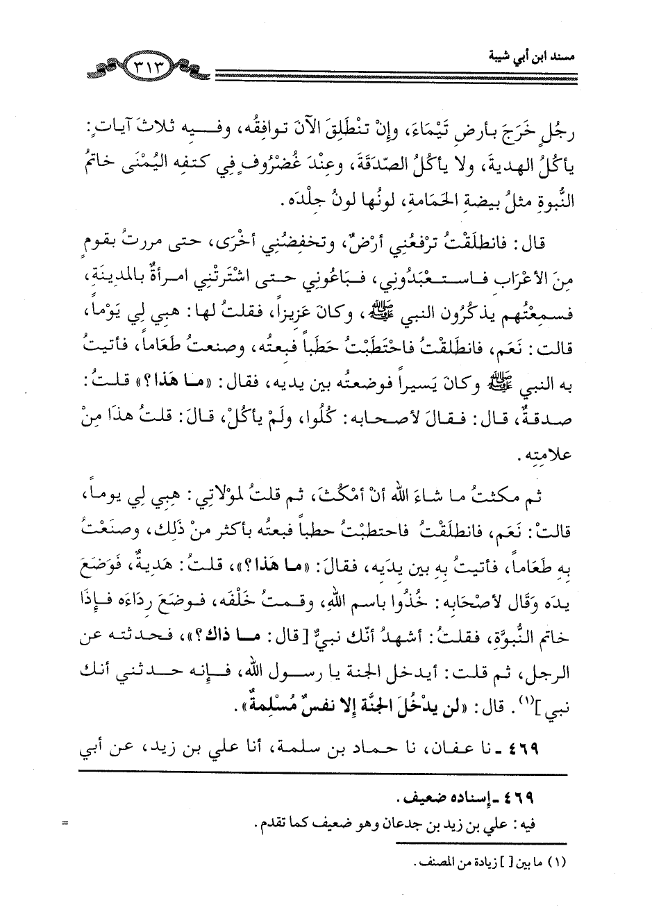 469 - نا عَفَّانُ، نَا حَمَّادُ بْنُ سَلَمَةَ، أَنَا عَلِيُّ بْنُ زَيْدٍ، عَنْ أَبِي -[314]- عُثْمَانَ، عَنْ سَلْمَانَ، قَالَ: كَاتَبْتُ أَهْلِي عَلَى أَنْ أَغْرِسَ لَهُمْ خَمْسَمِائَةِ فَسِيلَةٍ، فَإِذَا عَلَقَتْ فَأَنَا حُرٌّ، قَالَ: فَذَكَرْتُ ذَلِكَ لِلنَّبِيِّ صَلَّى اللهُ عَلَيْهِ وَسَلَّمَ فَقَالَ: «§إِذَا أَرَدْتَ أَنْ تَغْرِسَ فَآذِنِّي» ، فَآذَنْتُهُ فَغَرَسَهَا رَسُولُ اللَّهِ صَلَّى اللهُ عَلَيْهِ وَسَلَّمَ بِيَدِهِ إِلَّا وَاحِدَةً، غَرَسْتُهَا بِيَدِي، فَعَلَقْنَ جَمِيعًا إِلَّا الْوَاحِدَةُ الَّتِي غَرَسْتُهَا