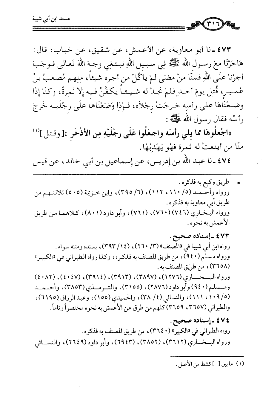473 - نا أَبُو مُعَاوِيَةَ، عَنِ الْأَعْمَشِ، عَنْ شَقِيقٍ، عَنْ خَبَّابٍ، قَالَ: هَاجَرْنَا مَعَ رَسُولِ اللَّهِ صَلَّى اللهُ عَلَيْهِ وَسَلَّمَ فِي سَبِيلِ اللَّهِ نَبْتَغِي وَجْهَ اللَّهِ تَعَالَى فَوَجَبَ أَجَرُنَا عَلَى اللَّهِ فَمِنَّا مَنْ مَضَى لَمْ يَأْكُلْ مِنْ أَجْرِهِ شَيْئًا، مِنْهُمْ مُصْعَبُ بْنُ عُمَيْرٍ، قُتِلَ يَوْمَ أُحُدٍ فَلَمْ نَجِدْ لَهُ شَيْئًا يُكَفَّنُ فِيهِ إِلَّا نَمِرَةً، وَكُنَّا إِذَا وَضَعْنَاهَا عَلَى رَأْسِهِ خَرَجْتْ رِجْلَاهُ، فَإِذَا وَضَعْنَاهَا عَلَى رِجْلَيْهِ خَرَجَ رَأْسُهُ، فَقَالَ رَسُولُ اللَّهِ صَلَّى اللهُ عَلَيْهِ وَسَلَّمَ: «§اجْعَلُوهَا مِمَّا يَلِي رَأْسَهُ وَاجْعَلُوا عَلَى رِجْلَيْهِ مِنَ الْأَذْخَرِ» وَقُتِلَ مِنَّا مِنْ أَيْنَعَتْ لَهُ ثَمَرَةٌ فَهُوَ يَهْدِبُهَا