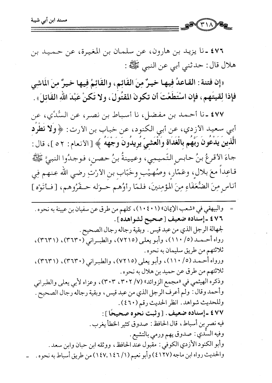 476 - نا يَزِيدُ بْنُ هَارُونَ، عَنْ سَلْمَانَ بْنِ الْمُغِيرَةِ، عَنْ حُمَيْدِ بْنِ هِلَالٍ، قَالَ: حَدَّثَنِي أَبِي، عَنِ النَّبِيِّ صَلَّى اللهُ عَلَيْهِ وَسَلَّمَ: " إِنَّ §فِتْنَةً: الْقَاعِدُ فِيهَا خَيْرٌ مِنَ الْقَائِمِ، وَالْقَائِمُ فِيهَا خَيْرٌ مِنَ الْمَاشِي، فَإِذَا لَقِيتَهُمْ، فَإِنِ اسْتَطَعْتَ أَنْ تَكُونَ الْمَقْتُولَ، وَلَا تَكُنْ عَبْدَ اللَّهِ الْقَاتِلَ "