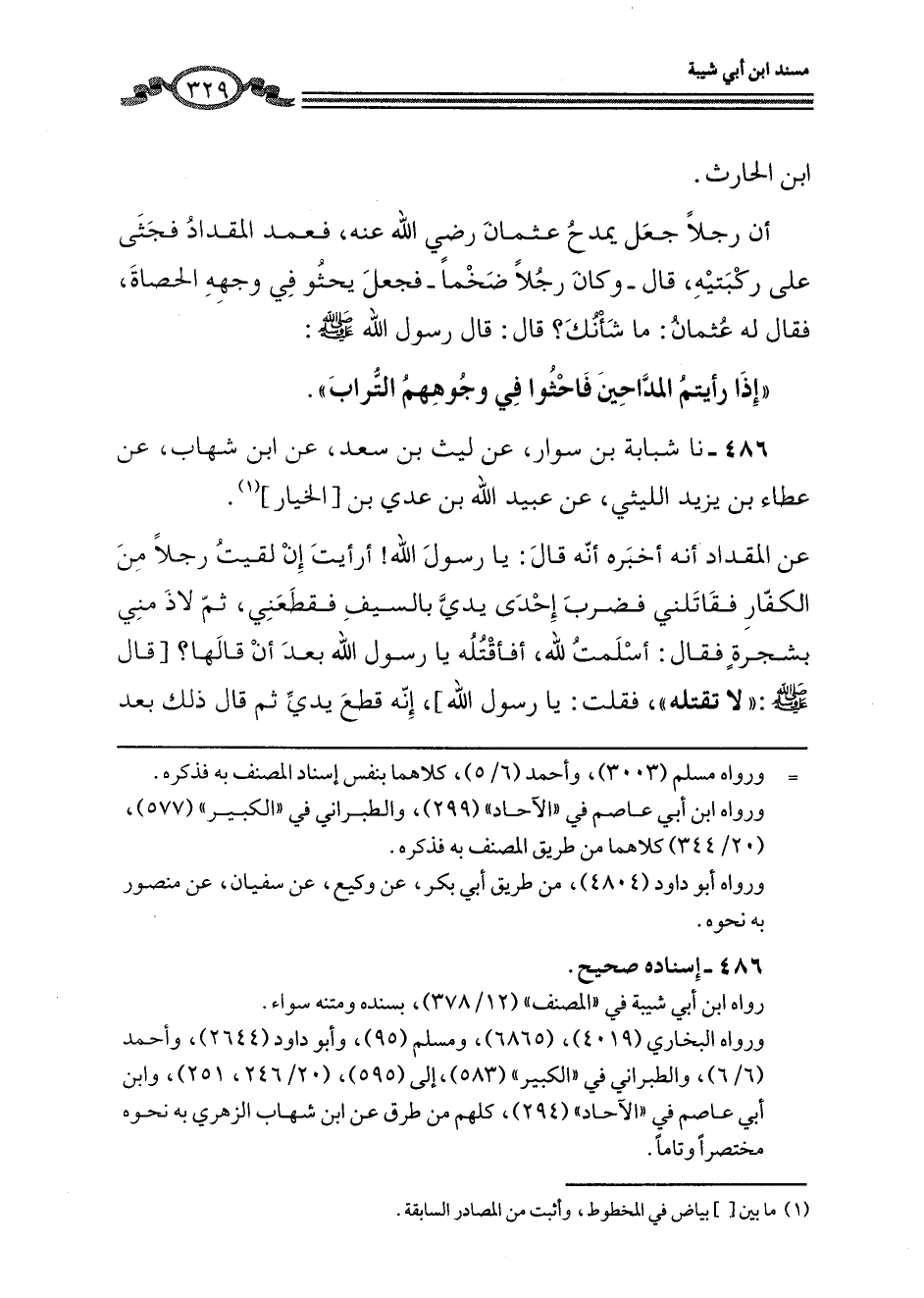486 - نا شَبَابَةُ بْنُ سَوَّارٍ، عَنْ لَيْثِ بْنِ سَعْدٍ، عَنِ ابْنِ شِهَابٍ، عَنْ عَطَاءِ بْنِ يَزِيدَ اللَّيْثِيِّ، عَنْ عُبَيْدِ اللَّهِ بْنِ عَدِيِّ بْنِ الْخِيَارِ، عَنِ الْمِقْدَادِ، أَنَّهُ أَخْبَرَهُ أَنَّهُ قَالَ: يَا رَسُولَ اللَّهِ أَرَأَيْتَ إِنْ لَقِيتُ رَجُلًا مِنَ الْكُفَّارِ فَقَاتَلَنِي فَضَرَبَ إِحْدَى يَدَيَّ بِالسَّيْفِ فَقَطَعَنِي، ثُمَّ لَاذَ مِنِّي بِشَجَرَةٍ، فَقَالَ: أَسْلَمْتُ لِلَّهِ، أَفَأَقْتُلُهُ يَا رَسُولَ اللَّهِ بَعْدَ أَنْ قَالَهَا؟ قَالَ صَلَّى اللهُ عَلَيْهِ وَسَلَّمَ: «§لَا تَقْتُلْهُ» ، فَقُلْتُ: يَا رَسُولَ اللَّهِ، إِنَّهُ قَطَعَ يَدِي، ثُمَّ قَالَ ذَلِكَ بَعْدَ -[330]- أَنْ قَطَعَهَا أَفَأَقْتُلُهُ؟ قَالَ: «لَا تَقْتُلْهُ، فَإِنْ قَتَلْتَهُ فَإِنَّهُ بِمَنْزِلَتِكَ قَبْلَ أَنْ تَقْتُلَهُ، وَأَنْتَ بِمَنْزِلَتِهِ قَبْلَ أَنْ يَقُولَ الْكَلِمَةَ الَّتِي قَالَهَا»