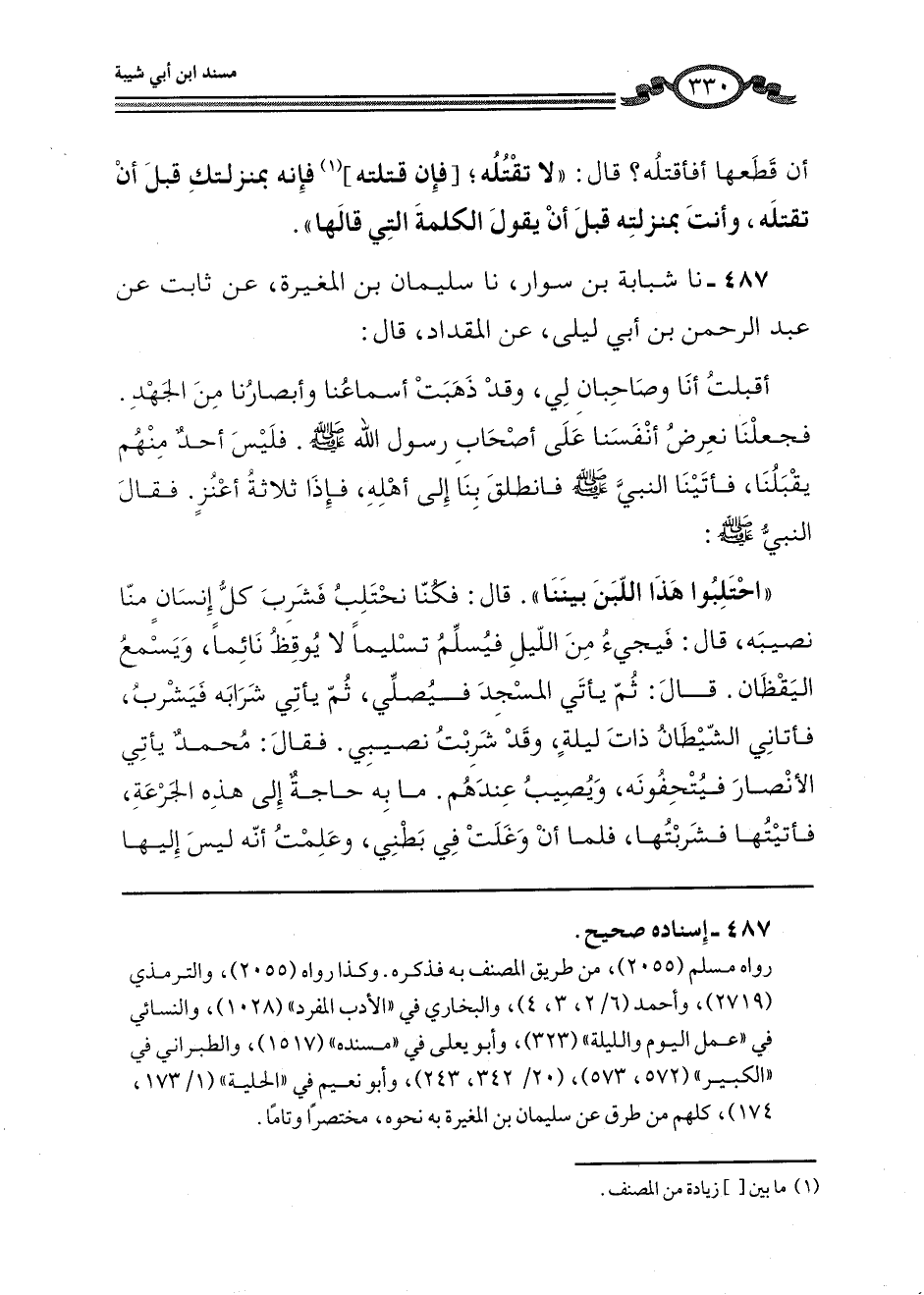 487 - نا شَبَابَةُ بْنُ سَوَّارٍ، نَا سُلَيْمَانُ بْنُ الْمُغِيرَةِ، عَنْ ثَابِتٍ، عَنْ عَبْدِ الرَّحْمَنِ بْنِ أَبِي لَيْلَى، عَنِ الْمِقْدَادِ، قَالَ: أَقْبَلْتُ أَنَا وَصَاحِبَانِ لِي، وَقَدْ ذَهَبَتْ أَسْمَاعُنَا وَأَبْصَارُنَا مِنَ الْجَهْدِ، فَجَعَلْنَا نَعْرِضُ أَنْفُسَنَا عَلَى أَصْحَابِ رَسُولِ اللَّهِ صَلَّى اللهُ عَلَيْهِ وَسَلَّمَ، فَلَيْسَ أَحَدٌ مِنْهُمْ يَقْبَلُنَا، فَأَتَيْنَا النَّبِيَّ صَلَّى اللهُ عَلَيْهِ وَسَلَّمَ فَانْطَلَقَ بِنَا إِلَى أَهْلِهِ، فَإِذَا ثَلَاثَةُ أَعْنُزٍ، فَقَالَ النَّبِيُّ صَلَّى اللهُ عَلَيْهِ وَسَلَّمَ: «احْتَلِبُوا هَذَا اللَّبَنَ بَيْنَنَا» ، قَالَ: فَكُنَّا نَحْتَلِبُ فَشَرِبَ كُلُّ إِنْسَانٍ مِنَّا نَصِيبَهُ، قَالَ: فَيَجِيءُ مِنَ اللَّيْلِ فَيُسَلِّمُ تَسْلِيمًا لَا يُوقِظُ نَائِمًا، وَيُسْمِعُ الْيَقْظَانَ، قَالَ: ثُمَّ يَأْتِي الْمَسْجِدَ فَيُصَلِّي، ثُمَّ يَأْتِي شَرَابَهُ فَيَشْرَبُ، فَأَتَانِي الشَّيْطَانُ ذَاتَ لَيْلَةٍ، وَقَدْ شَرِبْتُ نَصِيبِي، فَقَالَ: مُحَمَّدٌ يَأْتِي الْأَنْصَارَ فَيُتْحِفُونَهُ، وَيُصِيبُ عِنْدَهُمْ، مَا بِهِ حَاجَةٌ إِلَى هَذِهِ الْجَرَعَةِ، فَأَتَيْتُهَا فَشَرِبْتُهَا، فَلَمَّا أَنْ وَغَلَتْ فِي بَطْنِي، وَعَلِمْتُ أَنَّهُ لَيْسَ إِلَيْهَا -[331]- سَبِيلٌ، قَالَ: نَدَّمَنِي الشَّيْطَانُ، فَقَالَ: وَيْحَكَ مَا صَنَعْتَ؟ أَشَرِبْتَ شَرَابَ مُحَمَّدٍ؟ فَيَجِيءُ فَلَا يَجِدُهُ فَيَدْعُو عَلَيْكَ فَتَهْلِكُ، فَتَذْهَبُ دُنْيَاكَ وَآخِرَتُكَ، وَعَلَيَّ شَمْلَةٌ، إِذَا وَضَعْتُهَا عَلَى قَدَمِي خَرَجَ رَأْسِي، وَإِذَا وَضَعْتُهَا عَلَى رَأْسِي خَرَجَ قَدَمَايَ، وَجَعَلَ لَا يَجِيئُنِي النَّوْمُ، وَأَمَّا صَاحِبَايَ، فَنَامَا وَلَمْ يَصْنَعَا مَا صَنَعْتُ، قَالَ: فَجَاءَ النَّبِيُّ صَلَّى اللهُ عَلَيْهِ وَسَلَّمَ فَسَلَّمَ كَمَا يُسَلِّمُ، ثُمَّ أَتَى الْمَسْجِدَ فَصَلَّى، ثُمَّ أَتَى شَرَابَهُ فَكَشَفَ عَنْهُ فَلَمْ يَجِدْ فِيهِ شَيْئًا، فَرَفَعَ رَأْسَهُ إِلَى السَّمَاءِ، فَقُلْتُ: الْآنَ يَدْعُو عَلَيَّ فَأَهْلَكُ، فَقَالَ: «§اللَّهُمَّ أَطْعِمْ مَنْ أَطْعِمْنِي، وَأَسِقِ مَنْ سَقَانِي» ، قَالَ: فَعَمَدْتُ إِلَى الشَّمْلَةِ فَشَدَدْتُهَا عَلَيَّ وَأَخَذْتُ الشَّفْرَةَ فَانْطَلَقْتُ إِلَى الْأَعْنُزِ أَيُّهَا أَسْمَنُ فَأَذْبَحُهَا لِرَسُولِ اللَّهِ صَلَّى اللهُ عَلَيْهِ وَسَلَّمَ فَإِذَا هِيَ حَافِلَةٌ، وَإِذَا هُنَّ حُفَّلٌ كُلُّهُنَّ، فَعَمَدْتُ إِلَى إِنَاءٍ لِآلِ مُحَمَّدٍ صَلَّى اللهُ عَلَيْهِ وَسَلَّمَ مَا كَانُوا يَطْمَعُونَ أَنْ يَحْتَلِبُوا فِيهِ، قَالَ: أَشَرِبْتُمْ شَرَابَكُمُ اللَّيْلَةَ؟ قَالَ: قُلْتُ: يَا رَسُولَ اللَّهِ اشْرَبْ فَشَرِبَ، ثُمَّ نَاوِلْنِي، فَلَمَّا عَرَفْتُ أَنَّ النَّبِيَّ صَلَّى اللهُ عَلَيْهِ وَسَلَّمَ قَدْ رُوِيَ، وَأَصَبْتُ دَعْوَتَهُ ضَحِكْتُ حَتَّى أُلْقِيتُ إِلَى الْأَرْضِ، قَالَ: فَقَالَ النَّبِيُّ صَلَّى اللهُ عَلَيْهِ وَسَلَّمَ: «إِحْدَى سَوْآتِكَ يَا مِقْدَادُ» فَقُلْتُ: يَا رَسُولَ اللَّهِ كَانَ مِنْ أَمْرِي كَذَا وَكَذَا، وَفَعَلْتُ كَذَا، فَقَالَ النَّبِيُّ صَلَّى اللهُ عَلَيْهِ وَسَلَّمَ: «مَا هَذِهِ إِلَّا رَحْمَةٌ مِنَ اللَّهِ، أَفَلَا كُنْتَ آذَنْتَنِي، فَتُوقِظُ صَاحِبَيْنَا فَيُصِيبَانِ مِنْهَا» . قَالَ: فَقُلْتُ: وَالَّذِي بَعَثَكَ بِالْحَقِّ مَا أُبَالِي إِذَا أَصَبْتُهَا وَأَصَبْتُهَا مَعَكَ مَنْ أَصَابَهَا مِنَ النَّاسِ