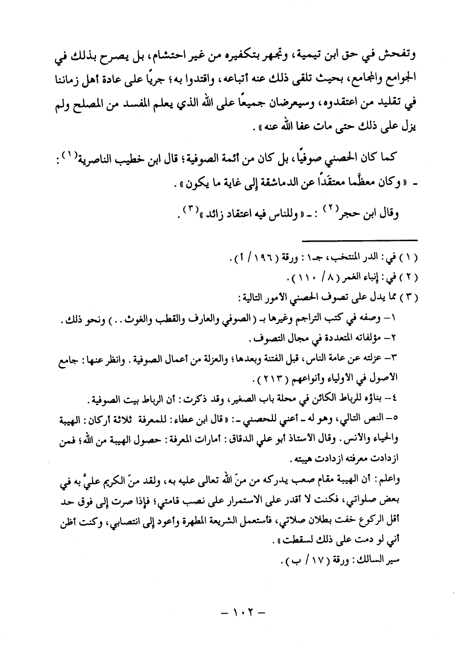 5 - النص التالي، وهو له -أعني للحصني-: "قال ابن عطاء: للمعرفة ثلاثة أركان: الهيبة والحياء والأنس. وقال الأستاذ أبو علي الدقاق: أمارات المعرفة: حصول الهيبة من الله، فمن ازدادت معرفته ازدادت هيبته.