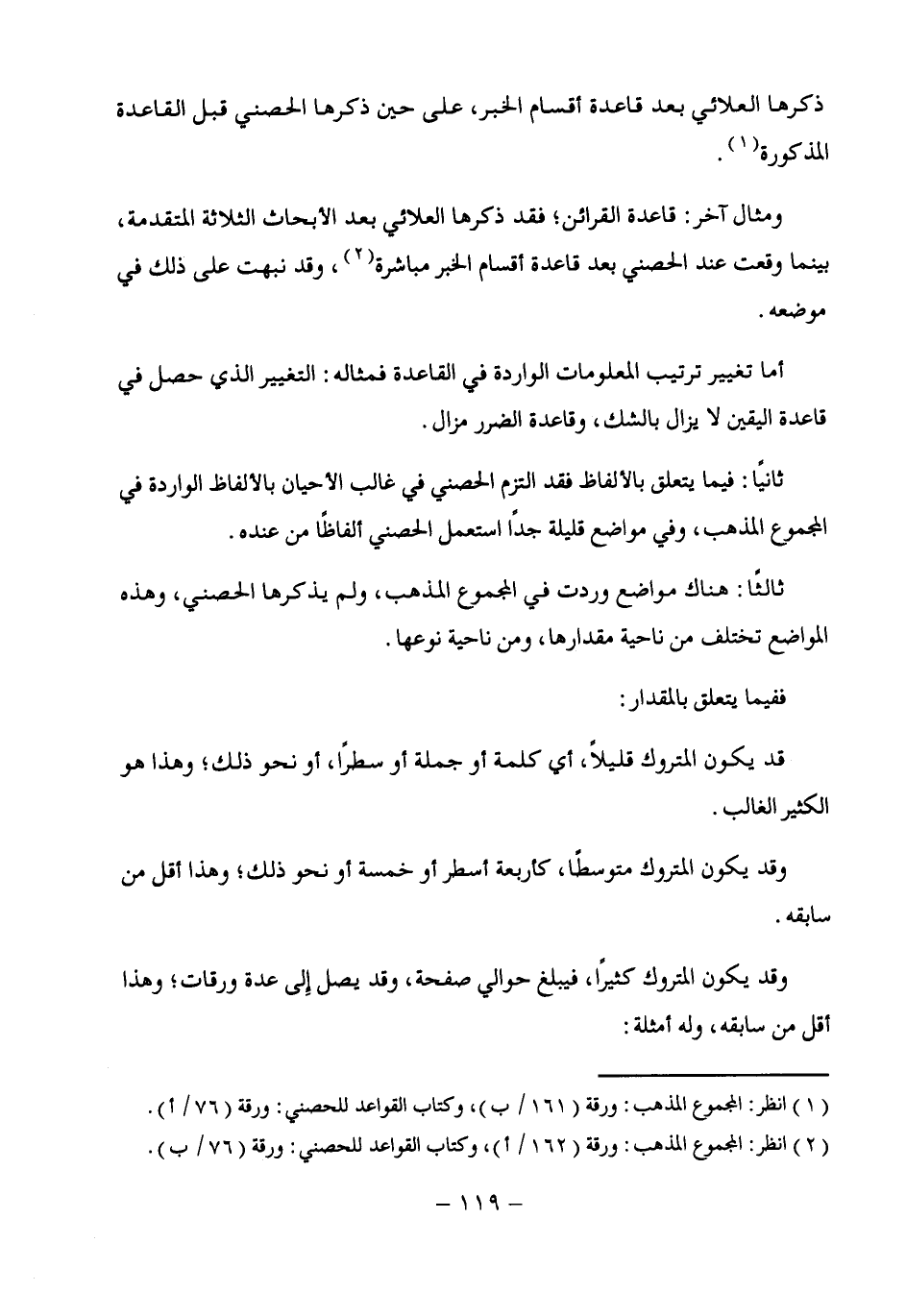 ومثال آخر: قاعدة القرائن، فقد ذكرها العلائي بعد الأبحاث الثلاثة المتقدمة، بينما وقعت عند الحصني بعد قاعدة أقسام الخبر مباشرة (¬2)، وقد نبهت على ذلك في موضعه.