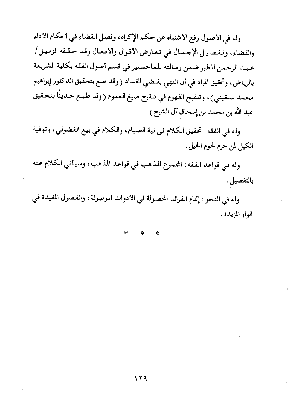 وله في الفقه: تحقيق الكلام في نية الصيام، والكلام في بيع الفضولي، وتوفية الكيل لمن حرم لحوم الخيل.