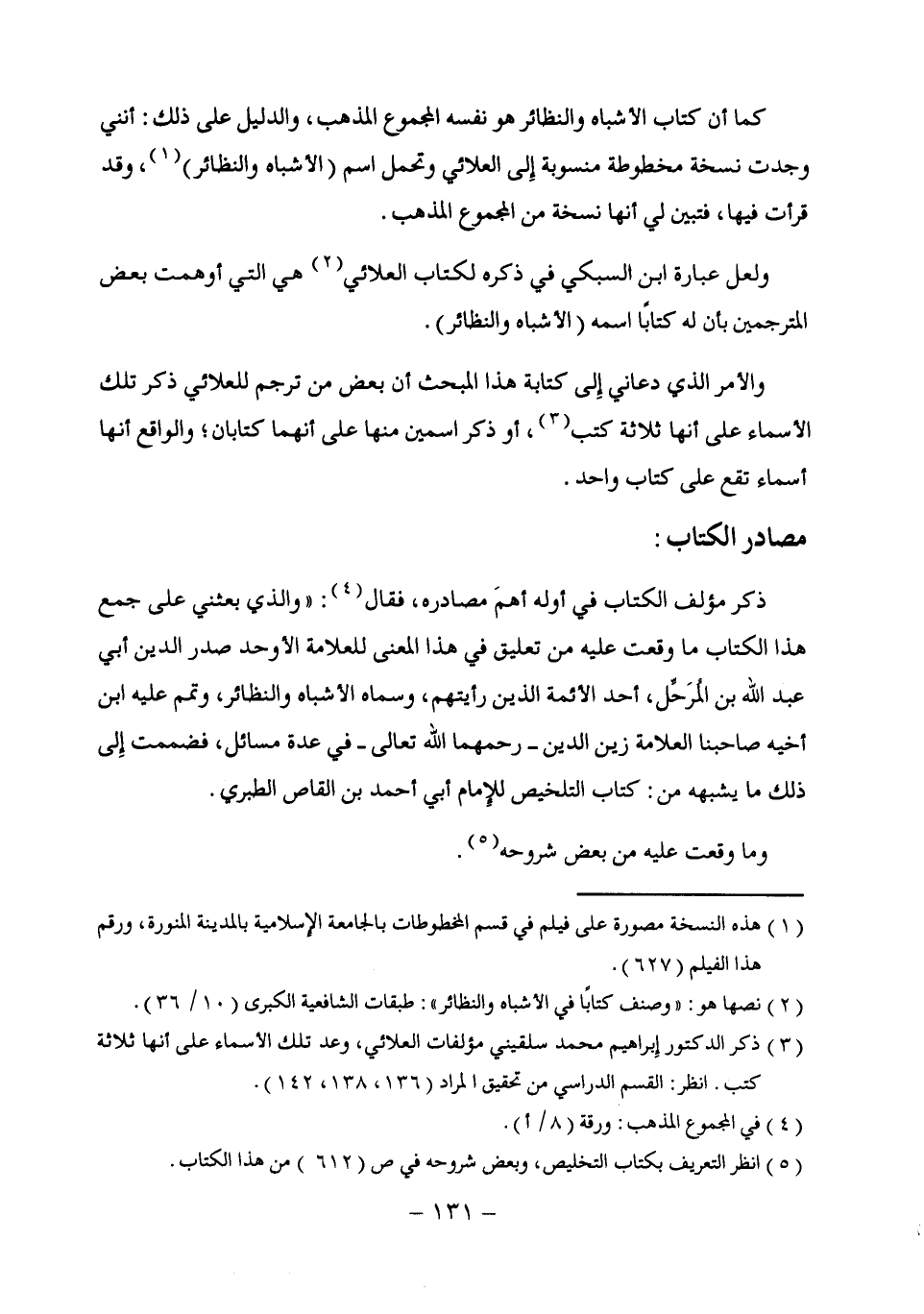 كما أن كتاب الأشباه والنظائر هو نفسه المجموع المذهب، والدليل على ذلك: أنني وجدت نسخة مخطوطة منسوبة إِلى العلائي وتحمل اسم (الأشباه والنظائر) (¬1)، وقد قرأت فيها، فتبين لي أنها نسخة من المجموع المذهب.