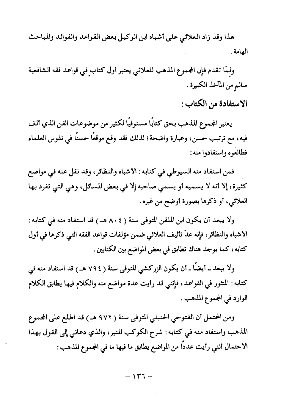 ولِمَا تقدم فإِن المجموع المذهب للعلائي يعتبر أول كتابٍ في قواعد فقه الشافعية سالمٍ من المآخذ الكبيرة.