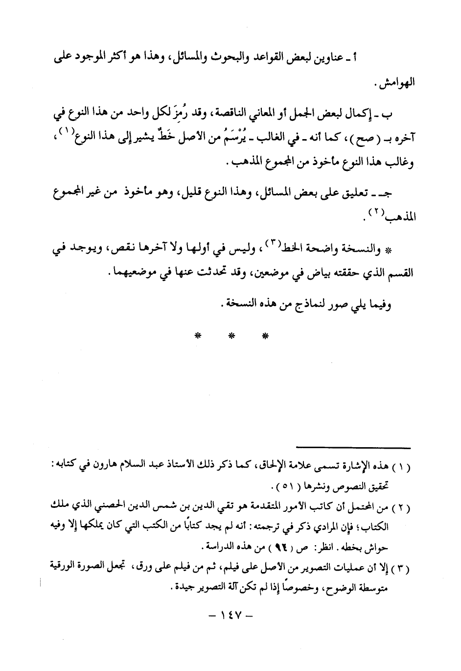 ب- إِكمال لبعض الجمل أو المعاني الناقصة، وقد رُمِزَ لكل واحد من هذا النوع في آخره بـ (صح)، كما أنه -في الغالب- يُرْسَمُ من الأصل خَطٌ يشير إِلى هذا النوع (¬1)، وغالب هذا النوع مأخوذ من المجموع المذهب.