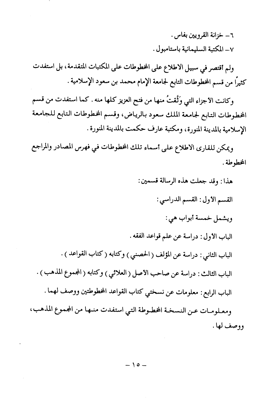 ولم أقتصر في سبيل الاطلاع على المخطوطات على المكتبات المتقدمة، بل استفدت كثيرًا من قسم المخطوطات التابع لجامعة الإِمام محمد بن سعود الإِسلامية.