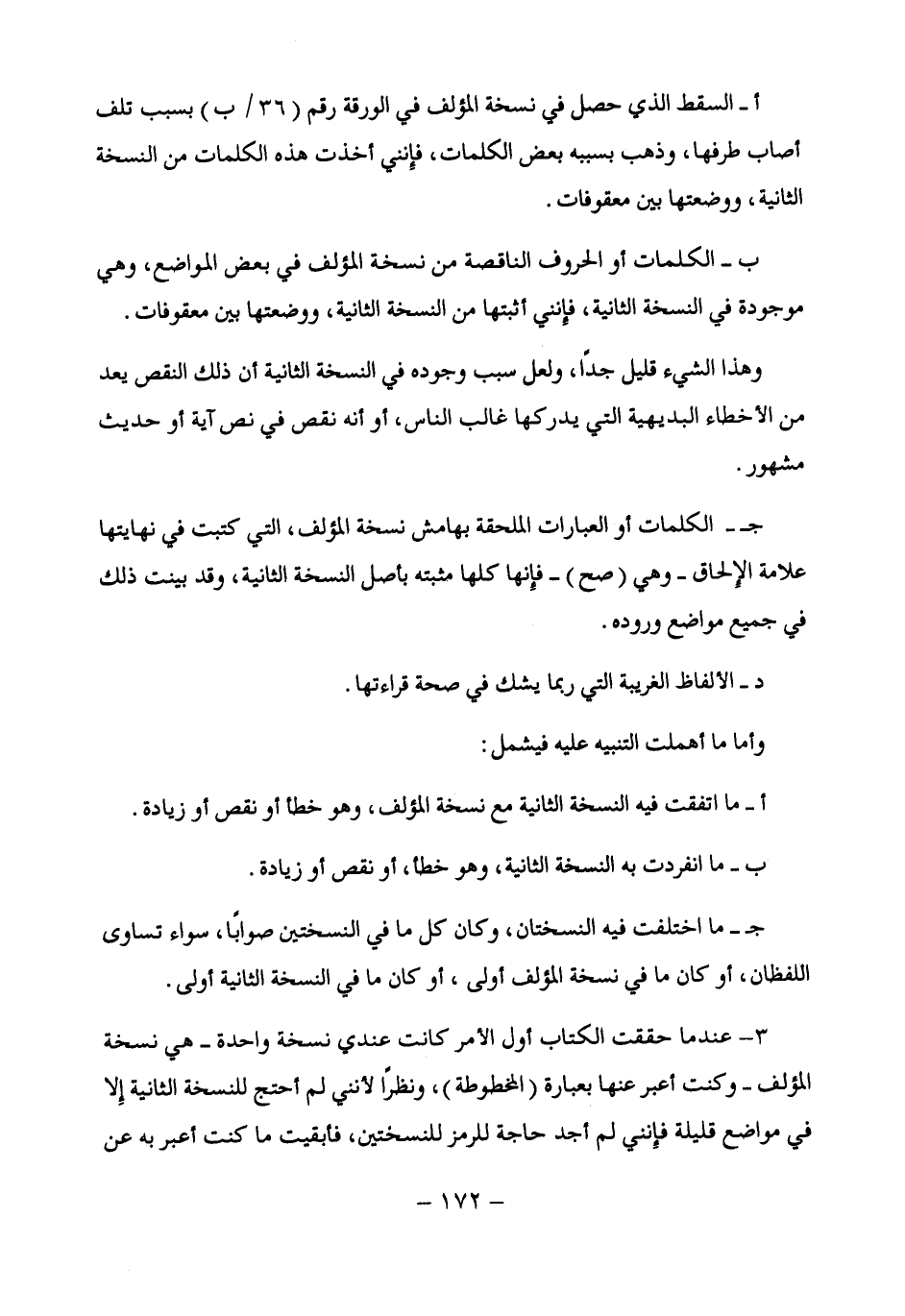 أ - السقط الذي حصل في نسخة المؤلف في الورقة رقم (36/ ب) بسبب تلف أصاب طرفها، وذهب بسببه بعض الكلمات، فإِنني أخذت هذه الكلمات من النسخة الثانية، ووضعتها بين معقوفات.