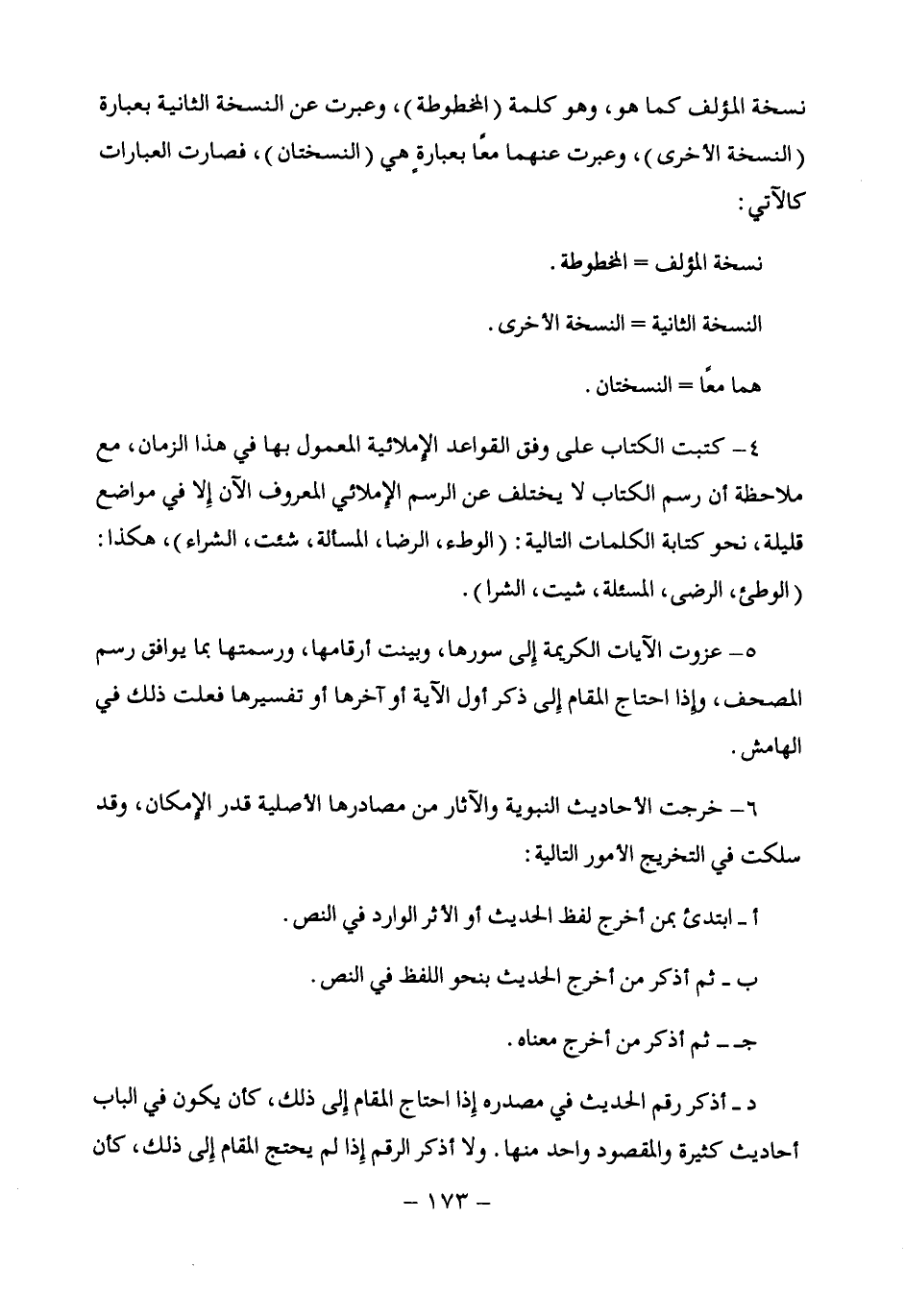 4 - كتبت الكتاب على وفق القواعد الإِملائية المعمول بها في هذا الزمان، مع ملاحظة أن رسم الكتاب لا يختلف عن الرسم الإِملائي المعروف الآن إِلا في مواضع قليلة، نحو كتابة الكلمات التالية: (الوطء، الرضا، المسألة، شئت، الشراء)، هكذا: (الوطئ، الرضى، المسئلة، شيت، الشرا).