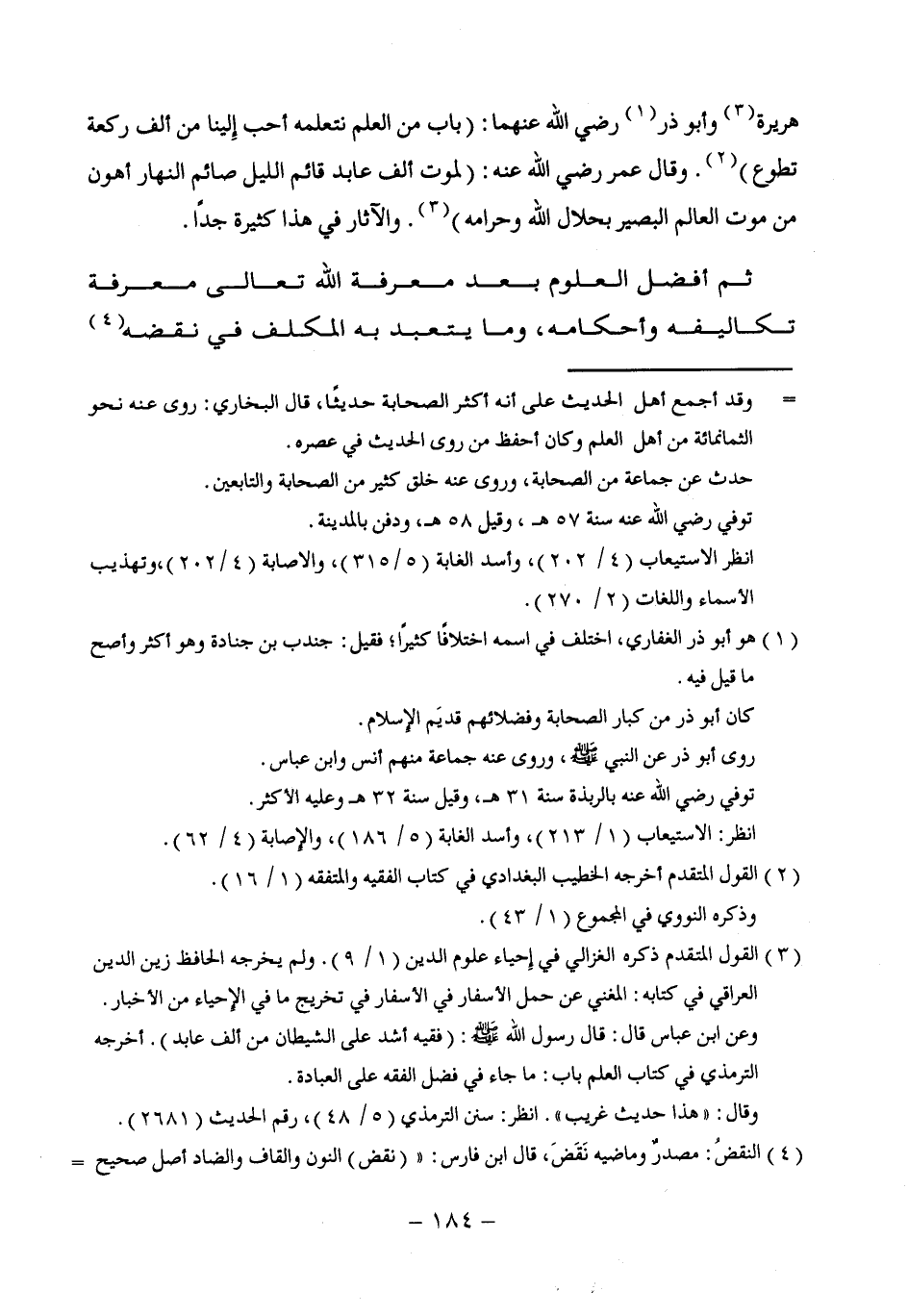 وأبو ذر (¬1) رضي الله عنهما: (باب من العلم نتعلمه أحب إِلينا من ألف ركعة تطوع) (¬2). وقال عمر رضي الله عنه: (لموت ألف عابد قائم الليل صائم النهار أهون من موت العالم البصير بحلال الله وحرامه) (¬3). والآثار في هذا كثيرة جدًا.