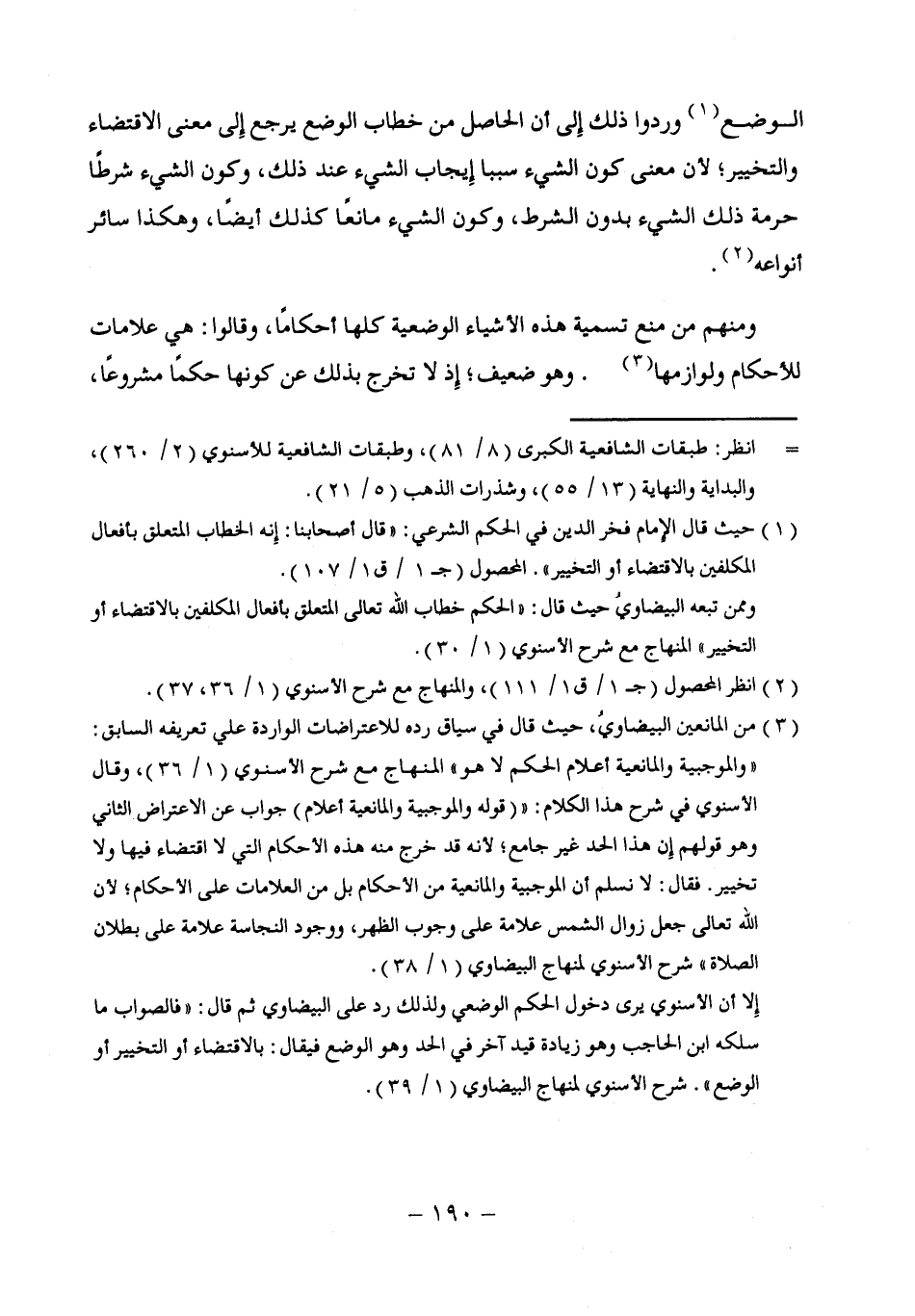 (¬3) من المانعين البيضاويُ، حيث قال في سياق رده للاعتراضات الواردة علي تعريفه السابق: "والموجبية والمانعية أعلام الحكم لا هو" المنهاج مع شرح الأسنوي (1/ 36)، وقال الأسنوي في شرح هذا الكلام: " (قوله والموجبية والمانعية أعلام) جواب عن الاعتراض الثاني وهو قولهم إِن هذا الحد غير جامع، لأنه قد خرج منه هذه الأحكام التي لا اقتضاء فيها ولا تخيير. فقال: لا نسلم أن الموجبية والمانعية من الأحكام بل من العلامات على الأحكام، لأن الله تعالى جعل زوال الشمس علامة على وجوب الظهر، ووجود النجاسة علامة على بطلان الصلاة" شرح الأسنوي لمنهاج البيضاوي (1/ 38).