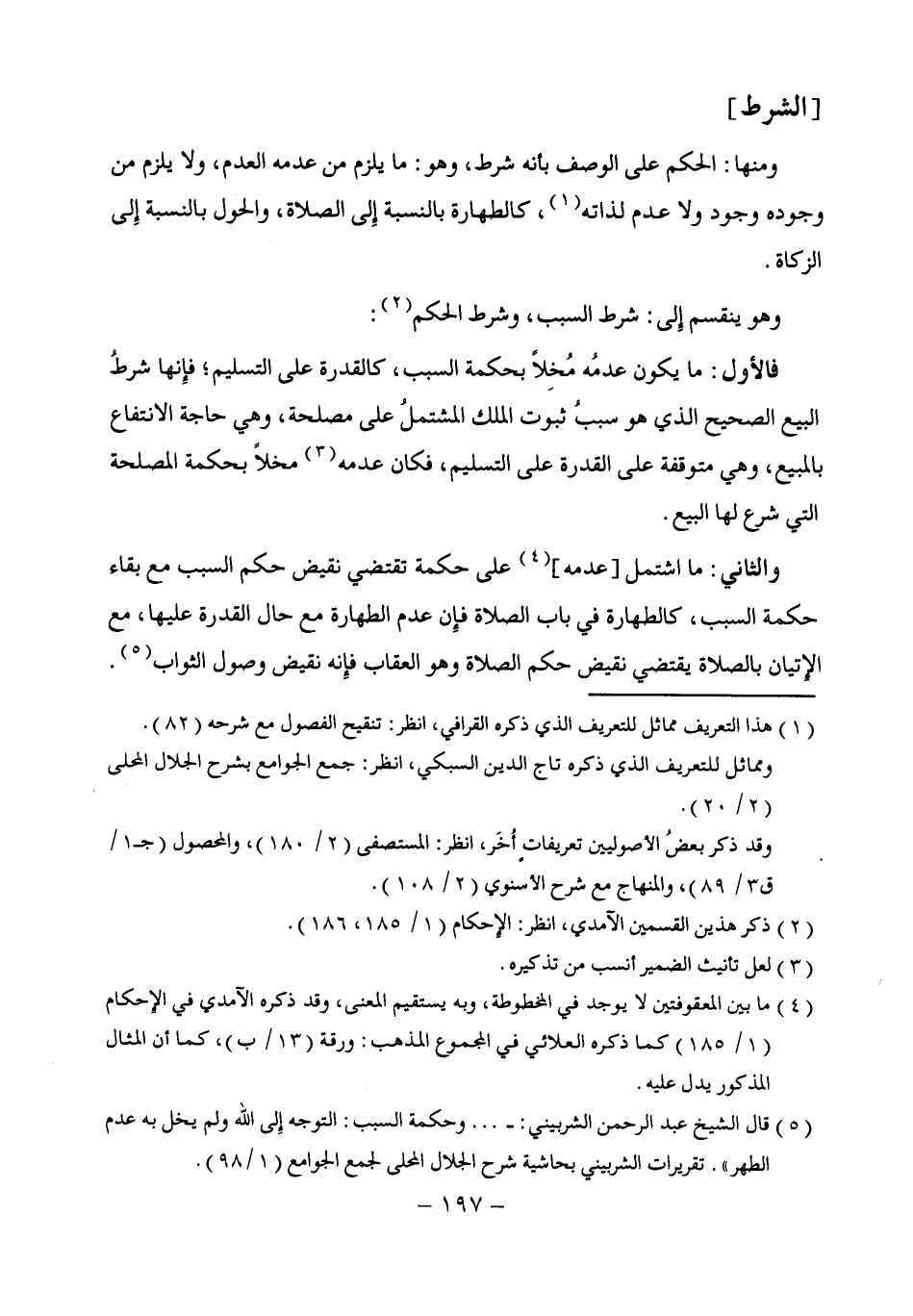 والثاني: ما اشتمل [عدمه] (¬4) على حكمة تقتضي نقيض حكم السبب مع بقاء حكمة السبب، كالطهارة في باب الصلاة فإِن عدم الطهارة مع حال القدرة عليها، مع الإِتيان بالصلاة يقتضي نقيض حكم الصلاة وهو العقاب فإِنه نقيض وصول الثواب (¬5).