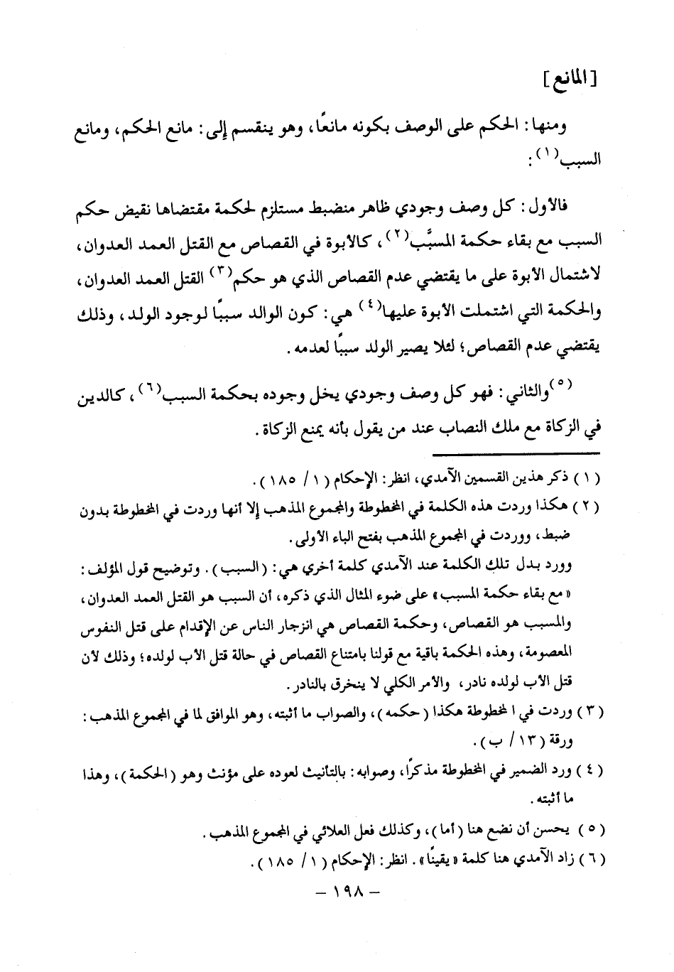 وورد بدل تلك الكلمة عند الآمدي كلمة أخرى هي: (السبب). وتوضيح قول المؤلف: "مع بقاء حكمة المسبب" على ضوء المثال الذي ذكره، أن السبب هو القتل العمد العدوان، والمسبب هو القصاص، وحكمة القصاص هي انزجار الناس عن الإِقدام على قتل النفوس المعصومة، وهذه الحكمة باقية مع قولنا بامتناع القصاص في حالة قتل الأب لولده، وذلك لأن قتل الأب لولده نادر، والأمر الكلي لا ينخرق بالنادر.