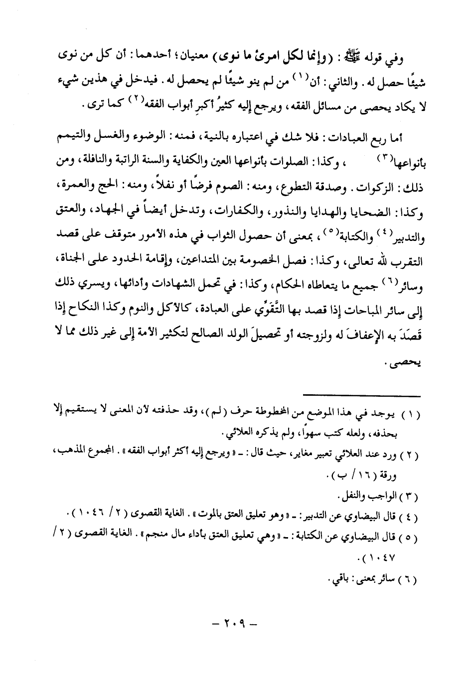 وفي قوله - صلى الله عليه وسلم -: (وإِنما لكل امرئ ما نوى) معنيان، أحدهما: أن كل من نوى شيئًا حصل له. والثاني: أن (¬1) من لم ينو شيئًا لم يحصل له. فيدخل في هذين شيء لا يكاد يحصى من مسائل الفقه، ويرجع إليه كثيرُ أكبرِ أبواب الفقه (¬2) كما ترى.