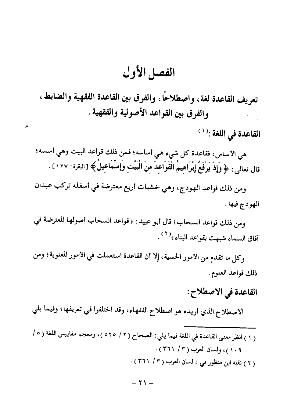 (¬1) انظر معنى القاعدة في اللغة فيما يلي: الصحاح (2/ 525)، ومعجم مقاييس اللغة (5/ 109)، ولسان العرب (3/ 361).