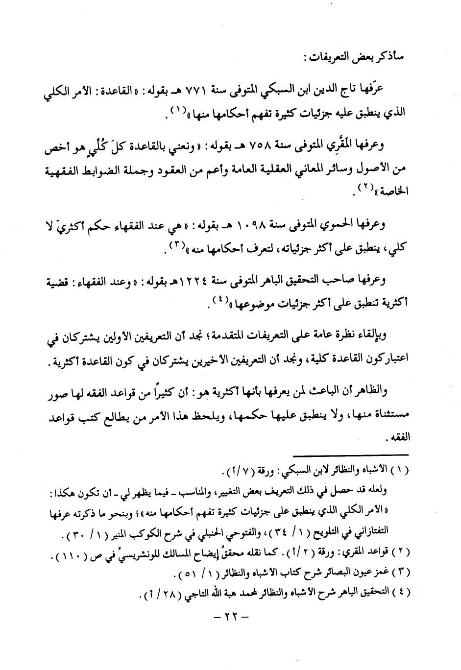 ولعله قد حصل في ذلك التعريف بعض التغيير، والمناسب -فيما يظهر لي- أن تكون هكذا: "الأمر الكلي الذي ينطبق على جزئيات كثيرة تفهم أحكامها منه"؛ وبنحو ما ذكرته عرفها التفتازاني في التلويح (1/ 34)، والفتوحي الحنبلي في شرح الكوكب المنير (1/ 30).